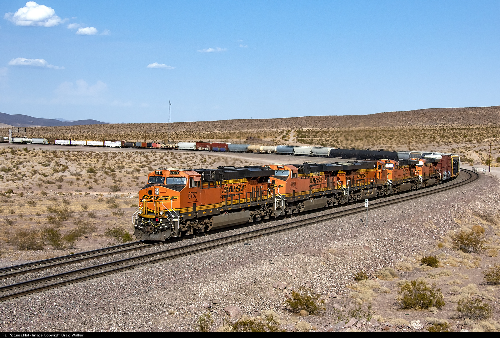 Mixed in among the nearly constant parade of Intermodal trains on BNSF Railway Needles Sub are a few "loose car" freights. One of these is seen there, as train H-BELBAR 3-12 (a High Priority Merchandise operating between Belen NM and Barstow CA) rounds the curve at milepost 694 – kinda, sorta midway between Needles and Barstow (if 32 miles west of center qualifies as "kinda, sorta".) Today's "BELBAR" has 97 cars stretching for 6293-feet, pulled by BNSF ES44C4 6767, ES44AC 5760, ES44C4 4265, ES44DC 7637 and ES44AC 5848 up front, and BNSF ET44C4 3863 and ES44C4 6602 on the rear – those late-model GE diesels all look so different! Note the DODX Flat with three US Marine Corps vehicles above the 6767's cab. (Ludlow, California – July 14, 2021)