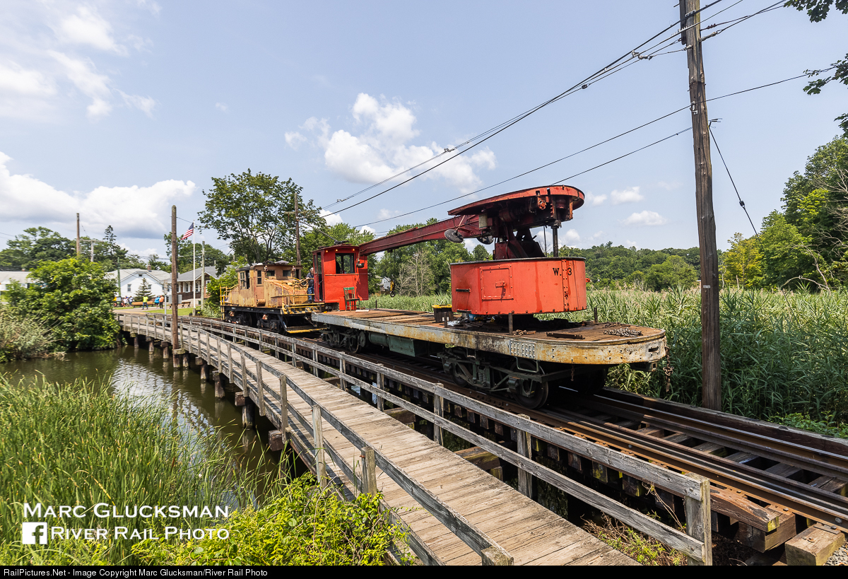 | Former Montreal Tramways crane W-3 was tasked with transporting former South Brooklyn Railway electric steeplecab engine #7 to the yard on Thursday, July 22, 2021. The pair are seen crossing the trestle from Sprague Station at The Shore Line Trolley Museum. |