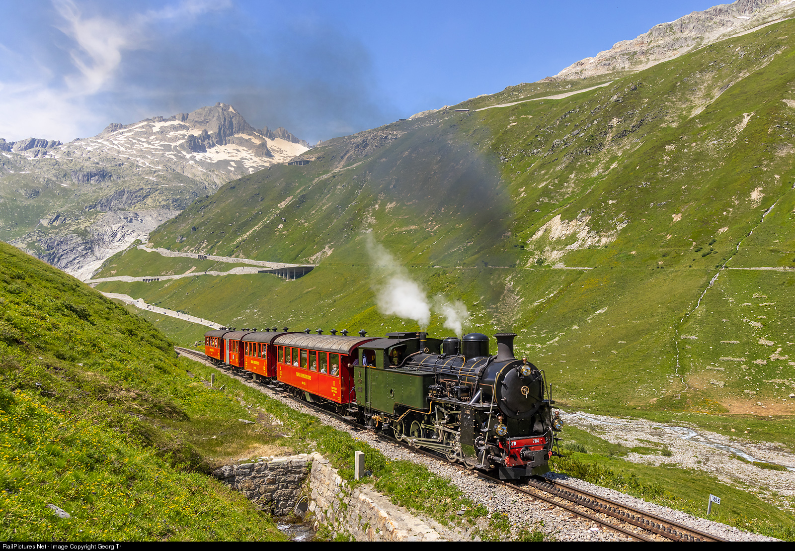 | Cogwheel steamlocomotive HG 4/4 # 704 of the Dampfbahn Furka Bergstrecke (DFB)/steam railway Furka mountain line) is pulling the train 154 from Oberwald to Realp on the 11.8 % grade between Gletsch and Muttbach-Belvédère. The cars are B # 4233 (of 1890), B # 2210 (1914), BD # 2503 (1914) and AB # 4462 (1914). In the background the 3166 meter high Vorder Gärstenhorn. |