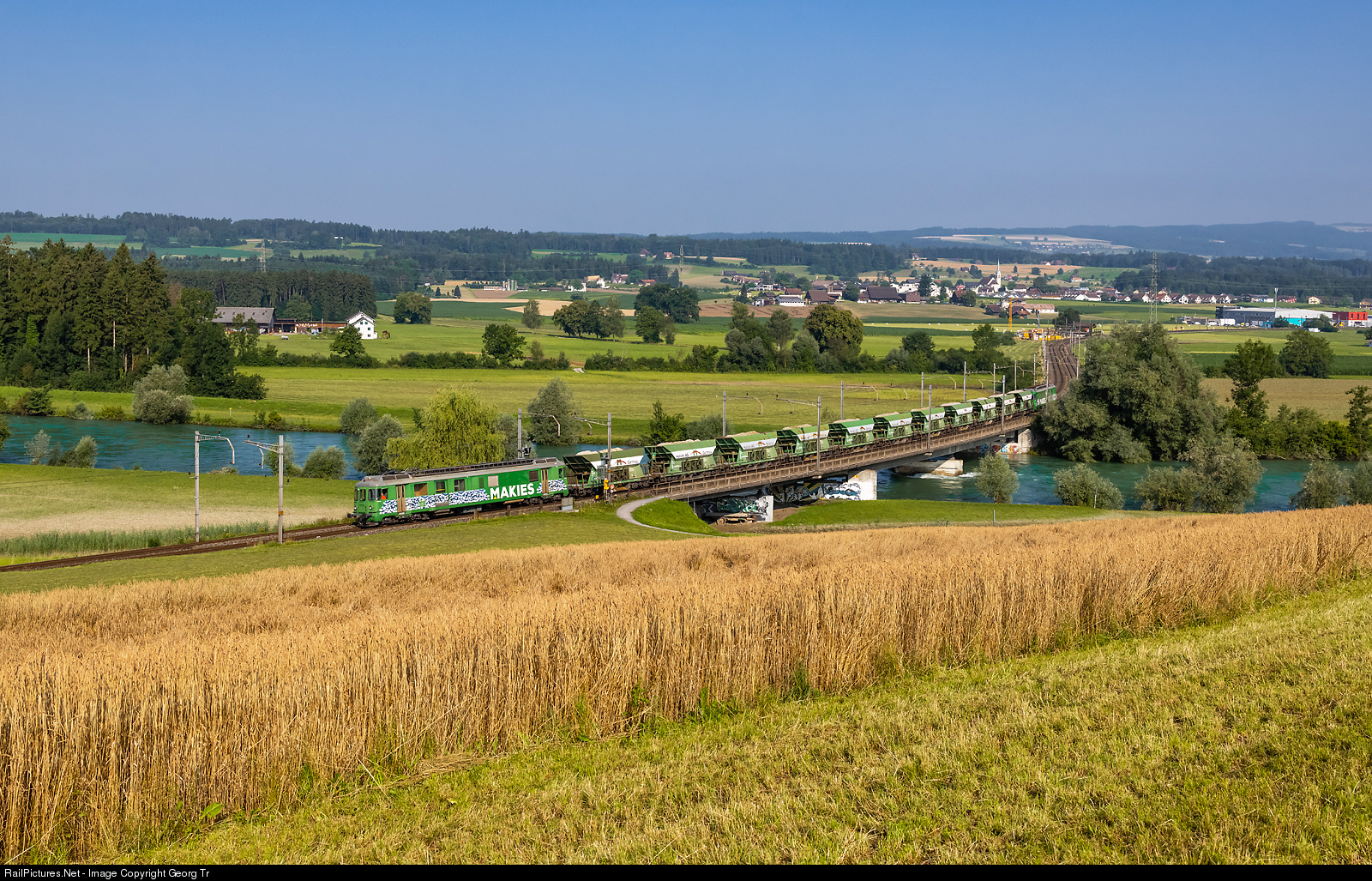 Passenger railcars in the freight train service! Former Südostbahn (SOB) high power railcars BDe 576 # 049 "Babette" (built in 1959 as BDe 4/4 # 81 with 1620 kW, running for Makies since 2008) pulling and BDe 576 # 059 "Gutemine" (built 1979 as BDe 4/4 # 87 with 2100 kW, running for Makies since 2018) in the rear in multiple control, with gravel train 67604 of the Makies AG from Gettnau via Huttwil-Langenthal-Olten-Lenzburg-Rotkreuz-Zug (switchback) to Affoltern am Albis, crossing the 150 meter long Reuss bridge between Oberrüti and Rotkreuz. The train is operated by Swiss Rail Traffic AG (SRTAG) and the railcars with the special paint scheme (adhesives) are called "stoned cucumbres". The river Reuss has an extraordinary amount of water (approx 400 m3/second), near the maximum that can/should be discharged in a controlled manner from Lake Lucerne (Vierwaldstättersee), which is in high flood after the heavy rains of the previous week. The long-term average is about 130 m3, which is about one third.