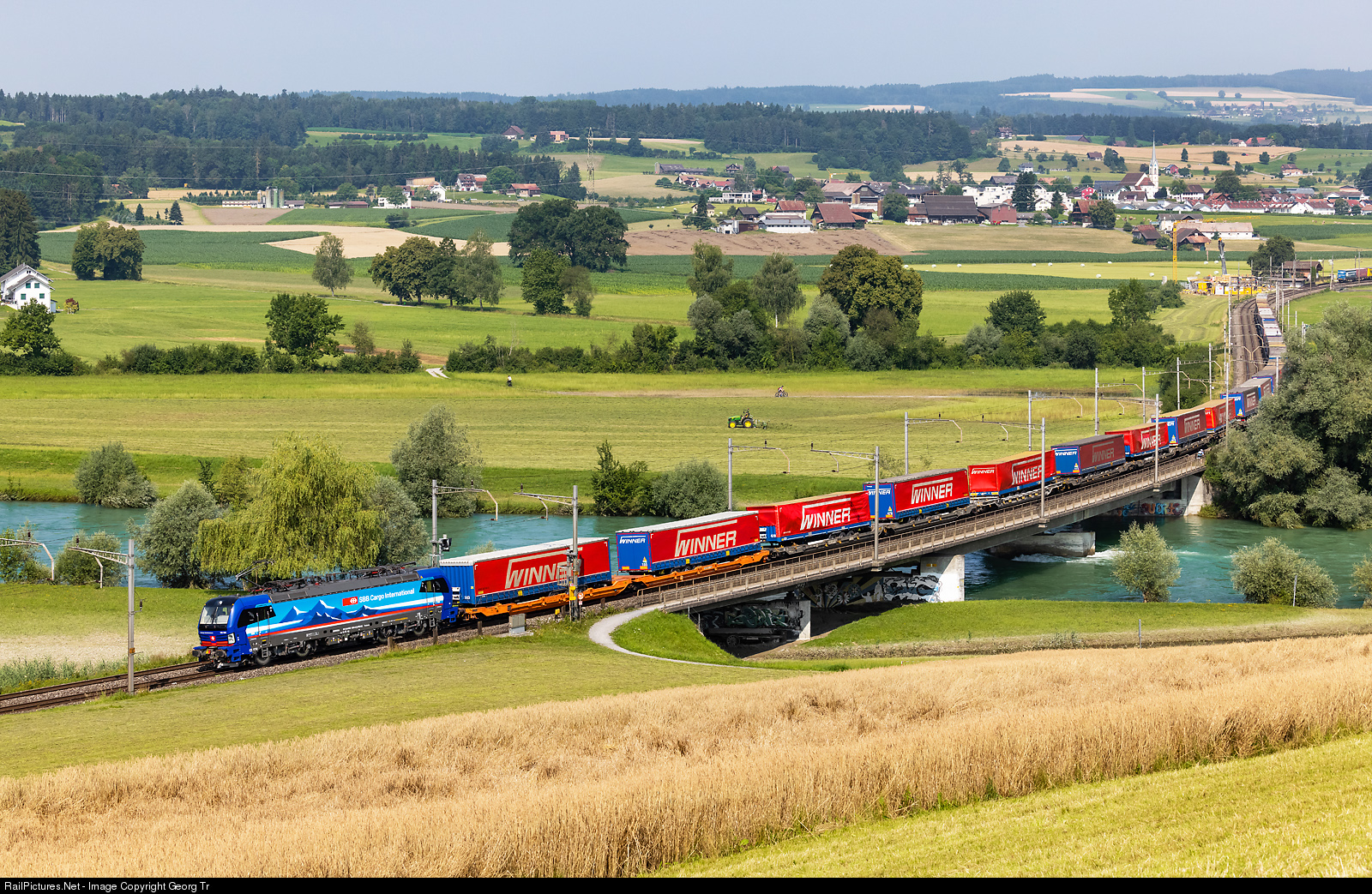 The astonishing clean Siemens "Vectron" 193 # 524 "Limmat" of SBB Cargo International (leased from the Südleasing Gmbh, Stuttgart) is pulling the southbound WINNER (large forwarder) intermodal train 42001 loaded with swap bodies from Wuppertal Langerfeld terminal/Germany via Basel-Bözberg-Gotthard and Ceneri Base Tunnels (GBT/CBT)-Chiasso to Piacenza/Italy, over the 150 meter long Reuss bridge between Oberrüti and Rotkreuz. The river Reuss has an extraordinary amount of water, the maximum that can/should be discharged in a controlled manner from Lake Lucerne (Vierwaldstättersee), which is in high flood after the heavy rains of the previous week.
