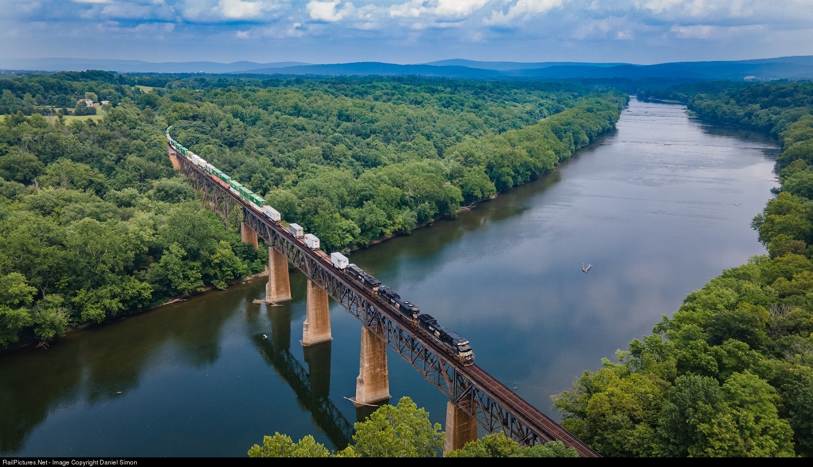 Norfolk Southern train 203 (Rutherford, PA-Atlanta, GA intermodal) crosses the Potomac River from Maryland into West Virginia southbound on the Norfolk Southern Hagerstown District.