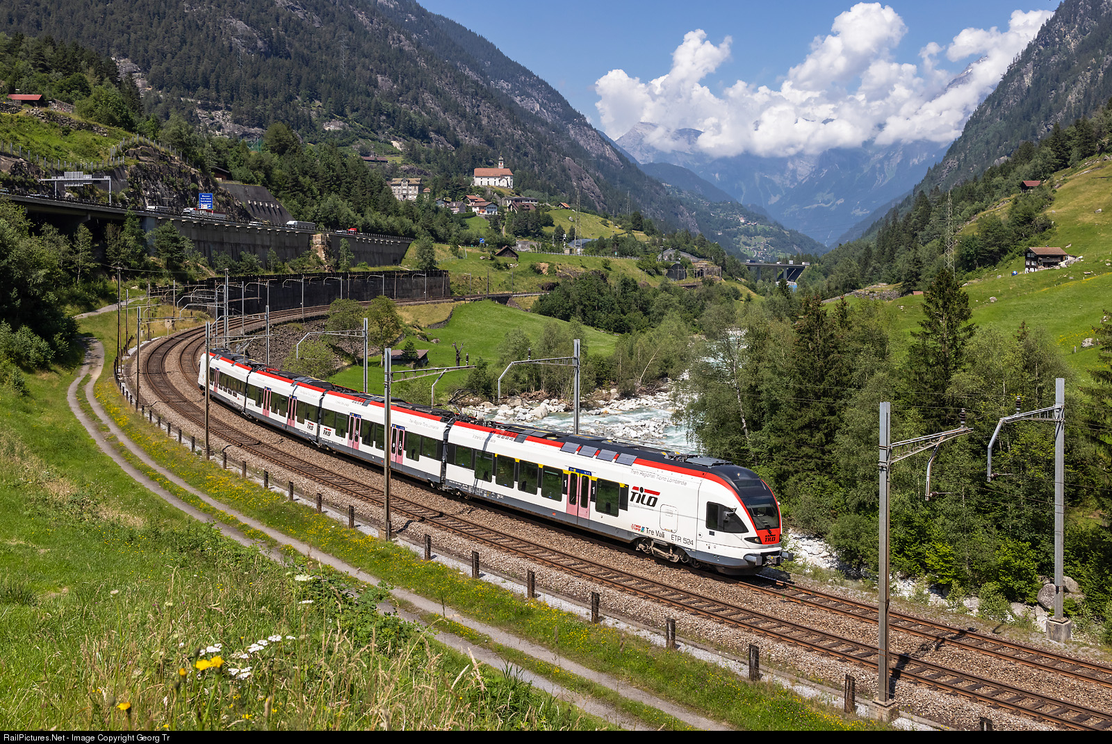 | Since change of timetable in december 2020, the TILO trains on the Gotthard mountain line have gone. The RABe 524 # 003 of the TILO is running as empty transfer run 32449 from Basel freight yard over the mountain to Bellinzona, through the Wattinger curve between Gurtnellen and Wassen. |