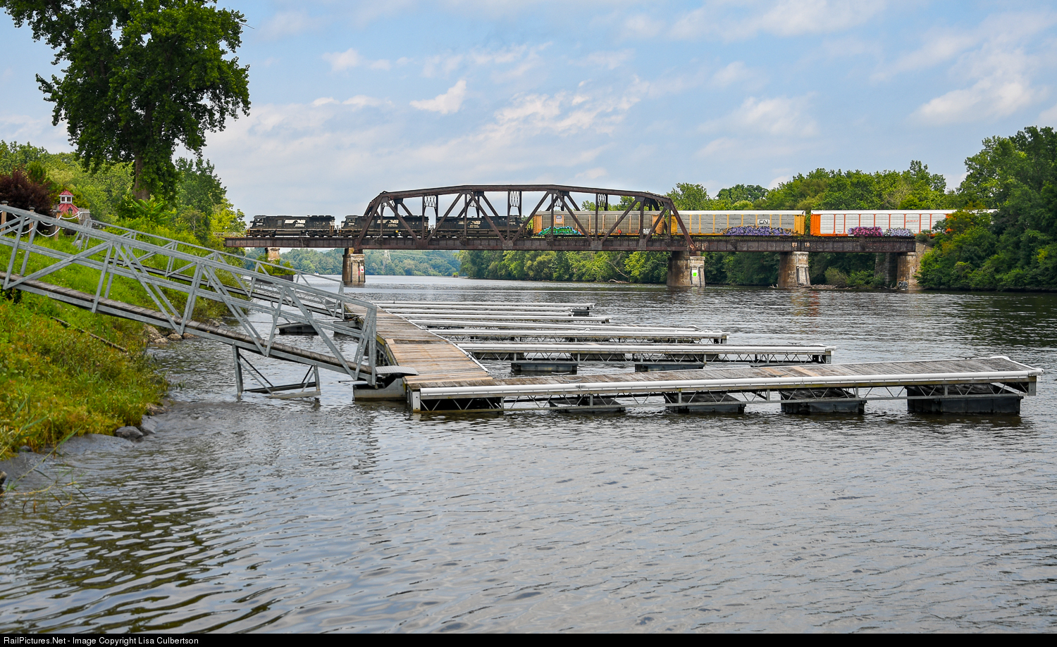 I'm not sure what was the bigger challenge here, the sun darting in an out from behind clouds, or keeping the camera straight while getting tossed about by the wake of a passing boat. At any rate, the NS 22K is shown here, crossing the Mohawk River Bridge as it approaches Mohawk Yard.