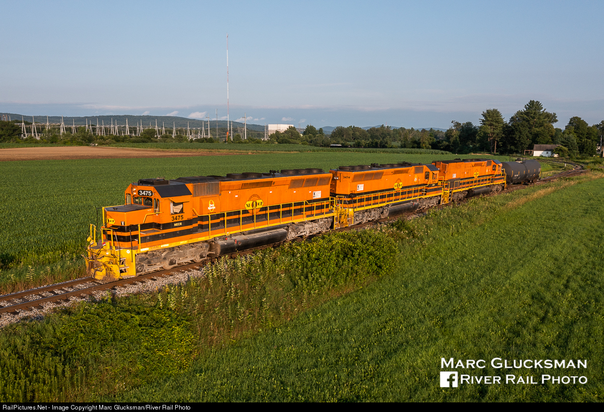 High Priority Or Really Heavy? On the evening of Monday, July 19, 2021, New England Central Railroad Train 323 (NECR SD40-2 3475 leading) pulls a single tank car across Fort Bridgman Road in Vernon, Vermont. In reality, the power is about to shove the car on to a siding and then hook up to its train for the rest of the trip. Multiple washouts on the line over the weekend have been repaired, but the backlog of cars means there are lots of deliveries to make on this day.