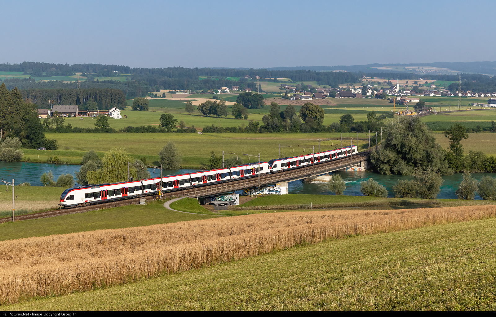 | Two "Flirt" trains of the RABe 523 series of the SBB are running the S 26 service 8632 from Rotkreuz via Wohlen-Lenzburg-Aarau to Olten over the 150 meter long Reuss bridge between Rotkreuz and Oberrüti. |