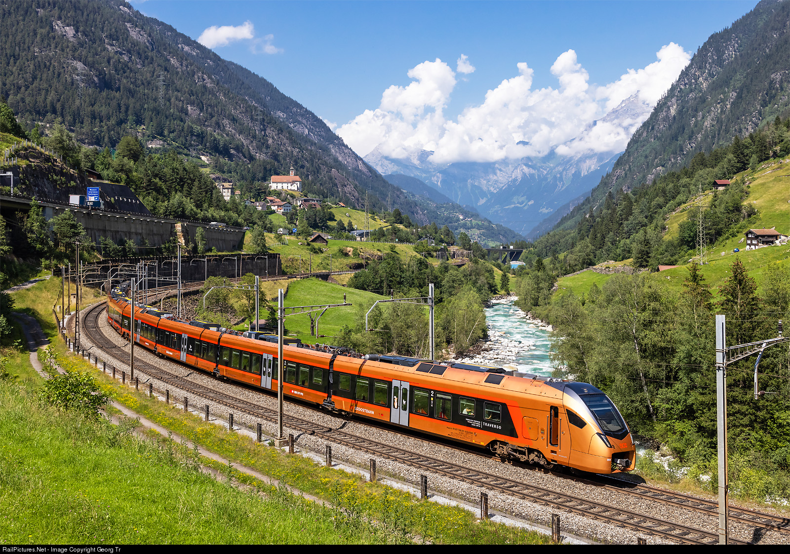 | "Traverso" train RABe 526 # 201/101 of the Südostbahn (SOB) is running the "Treno Gottardo" IR 2425 of the line IR 46 from Zürich via Zug-Arth Goldau-Erstfeld-Göschenen-Airolo-Biasca-Bellinzona to Locarno, through the Wattinger curve between Gurtnellen and Wassen. The Südostbahn is running this hourly service over the Gotthard mountain line in co-operation with the SBB since change of timetable in december 2020. |