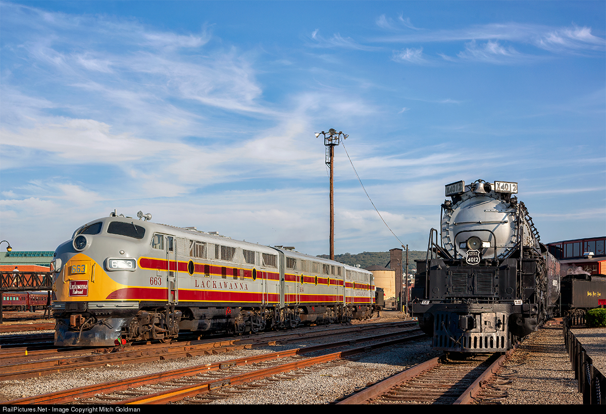 At 1,500 horsepower per F unit, an A-B-A set of Lackawanna locomotives sits one B unit shy of power needed to match that of the Union Pacific's 6,000 horsepower 4-8-8-4 Big Boy, sitting by its side. The A-B-A set of F units, however, are about 20' longer than the Big Boy, or just over 70' if there were another B unit. Today's modern diesel locomotives like the EMD SD90MAC match the Big Boy at 6,000 horsepower, though EMD's DDA40X, which were built in 1969 and exclusively used by Union Pacific were rated at 6,600 horsepower! And now you know!