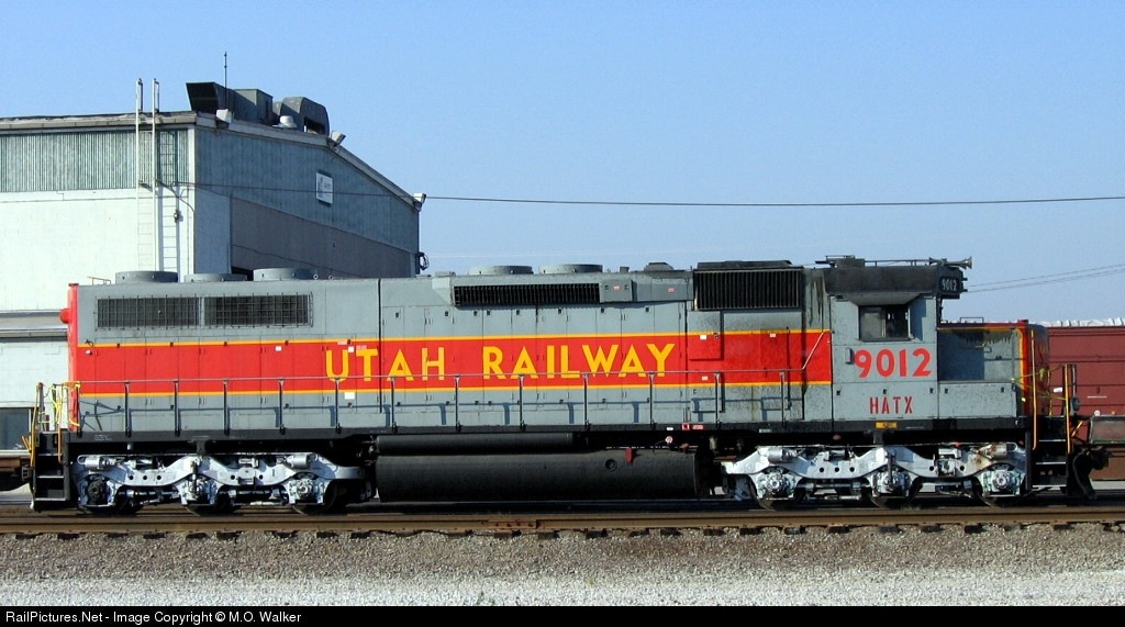 Leased unit in Utah Railway paint, built originally as SP 9083 SD45 in 1969, rebuilt by Morrison Knudsen in 1990.