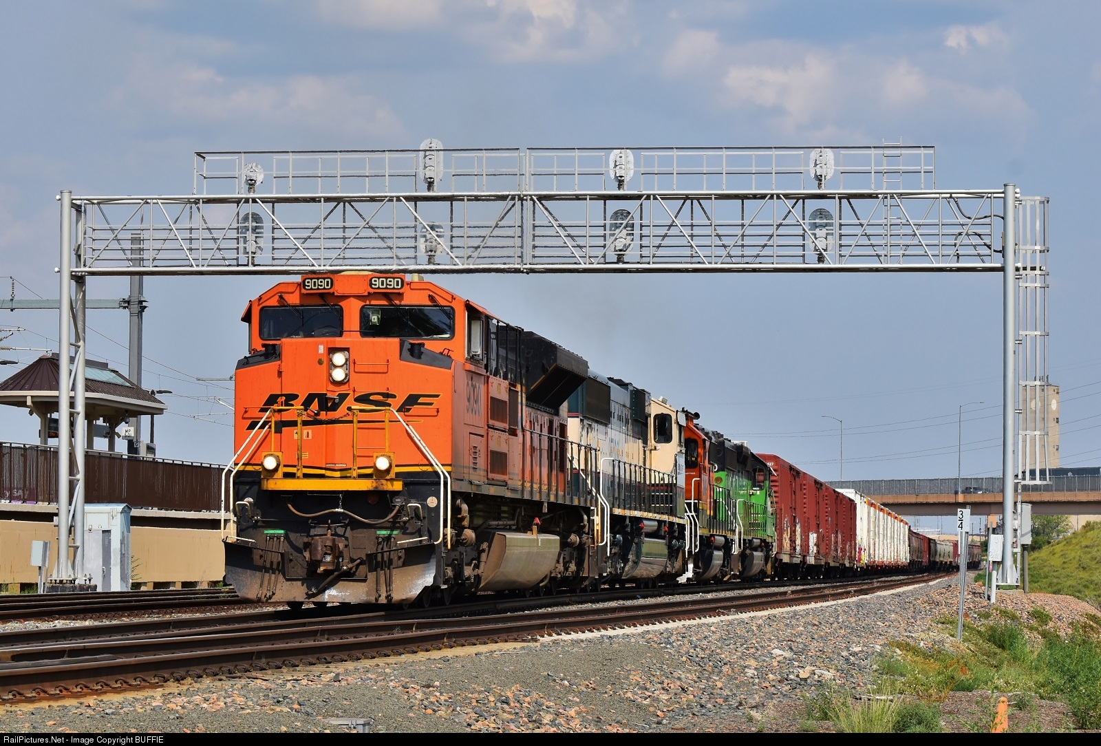 | BNSF 9090 (SD70ACe) leads an executive MAC and a BN green engine towards the Coors Brewery in Golden, Colorado. |