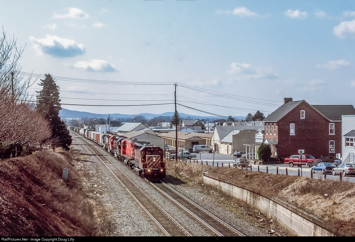 CP/D&H train 555 approaches the town center of Emmaus, Pennsylvania on Conrail’s East Penn line. One C424 is still in the mix in this March, 1992 view.