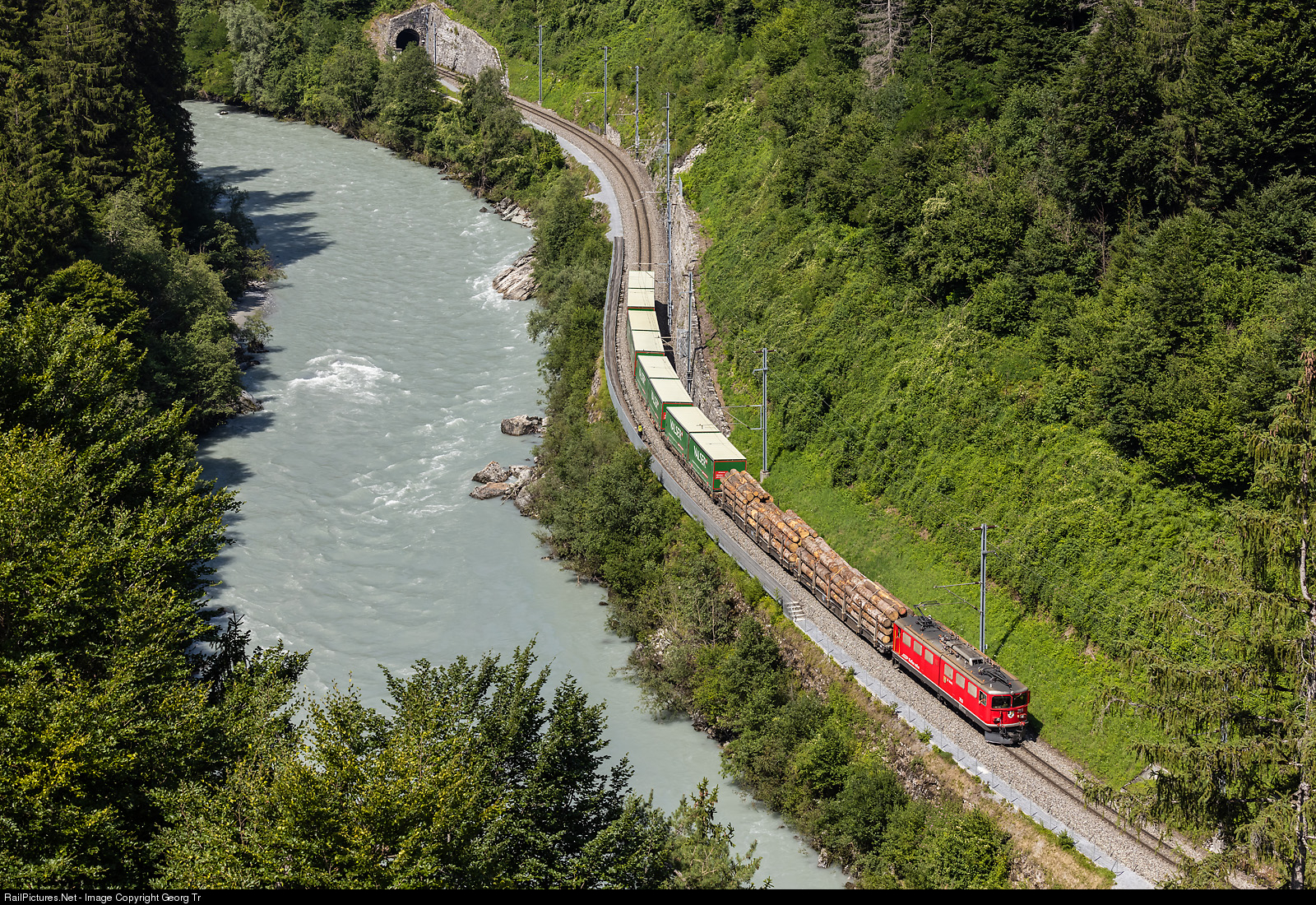 | Ge 6/6 II # 703 "St.Moritz" of the Rhaetian Railway is running along the Vorderrhein, between the 299 meter long Dabi tunnel and the narrow near the Wackenau fortress ruin with freight train 5732 from Ilanz to Landquart. |