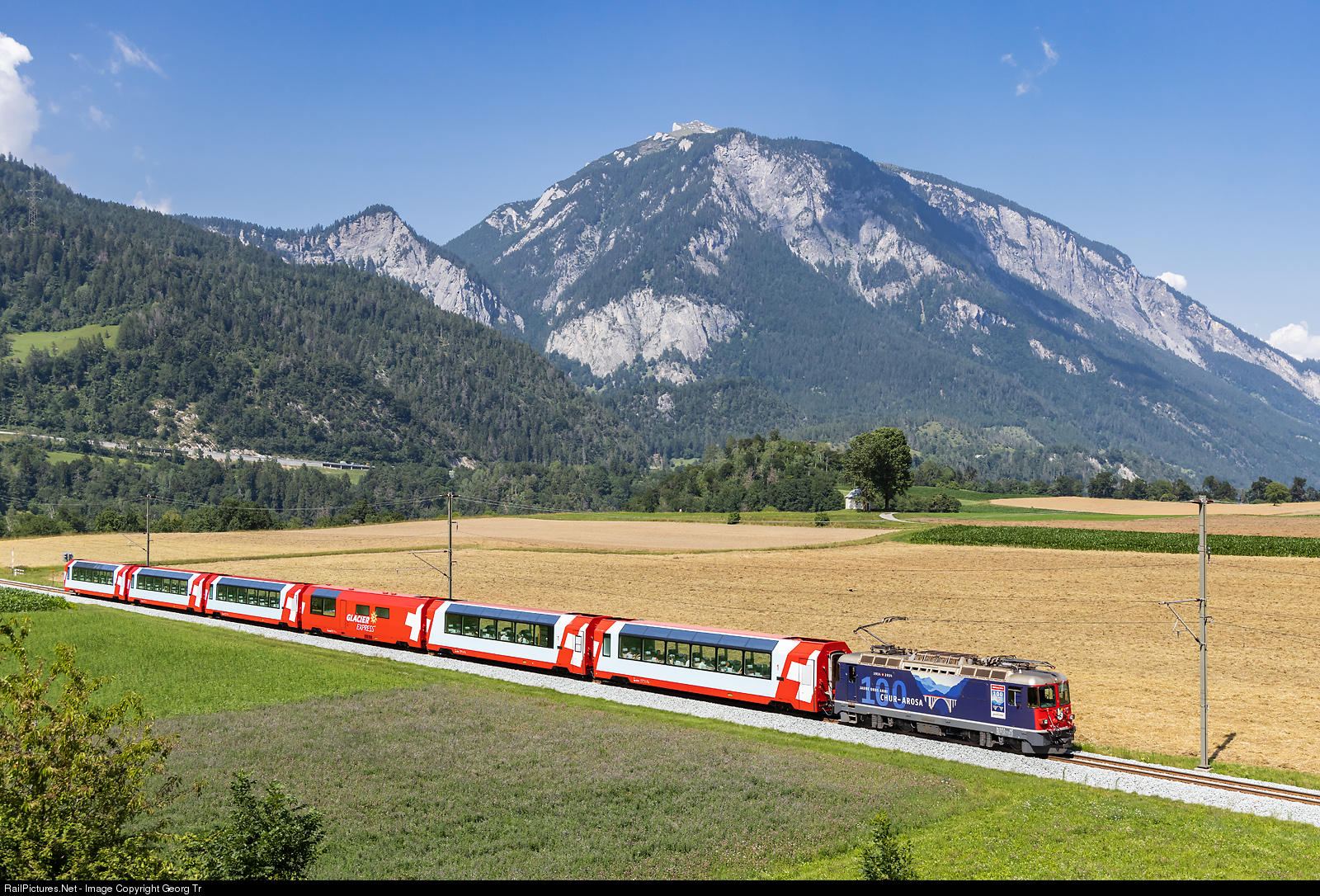 | The Ge 4/4 II # 627 of the Rhaetian Railway has since 2014 already a publicity paint scheme for 100 years railway line Chur-Arosa. The "ChA" was an independent 1 meter gauge railway from 1914 til 1942, when it was taken over by the Rhaetian Railway. The locomotive is pulling the PE (Panorama Express) 904 GLACIER EXPRESS Zermatt-St.Moritz, on the section Chur-St.Moritz, between Reichenau-Tamins and Bonaduz. |