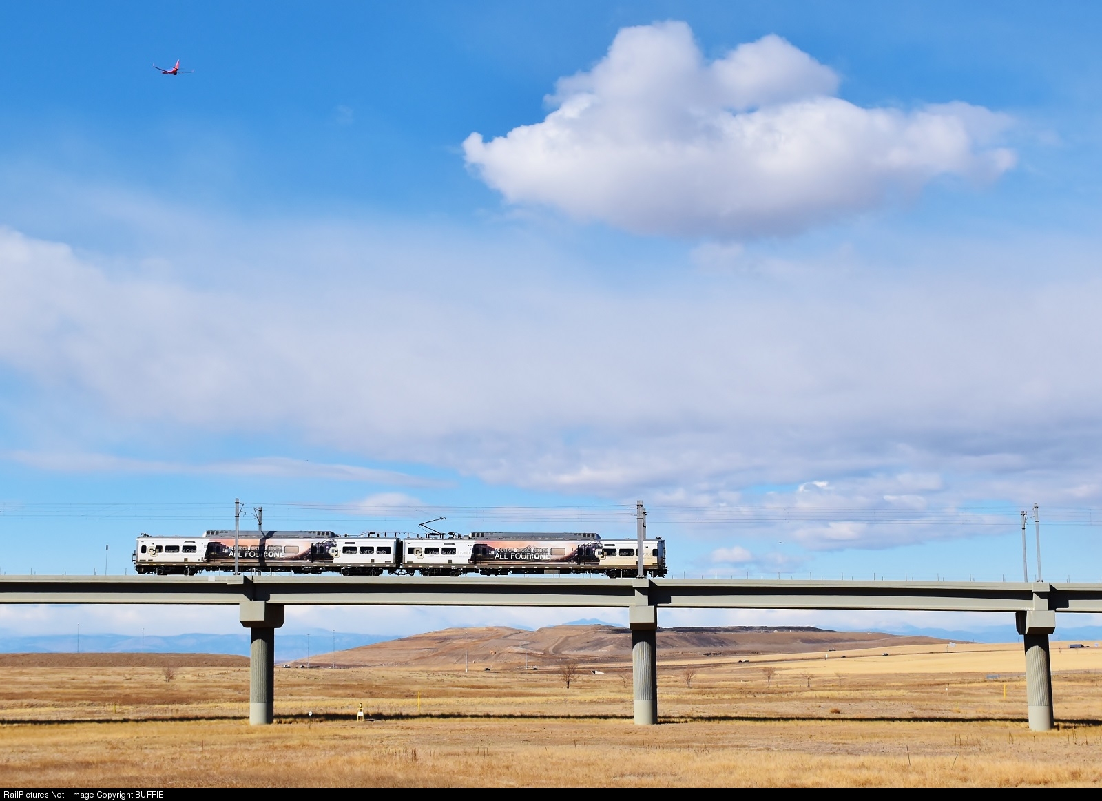 RTD commuter rail train #4023 leaves Denver International Airport and heads to downtown Denver's Union Station.