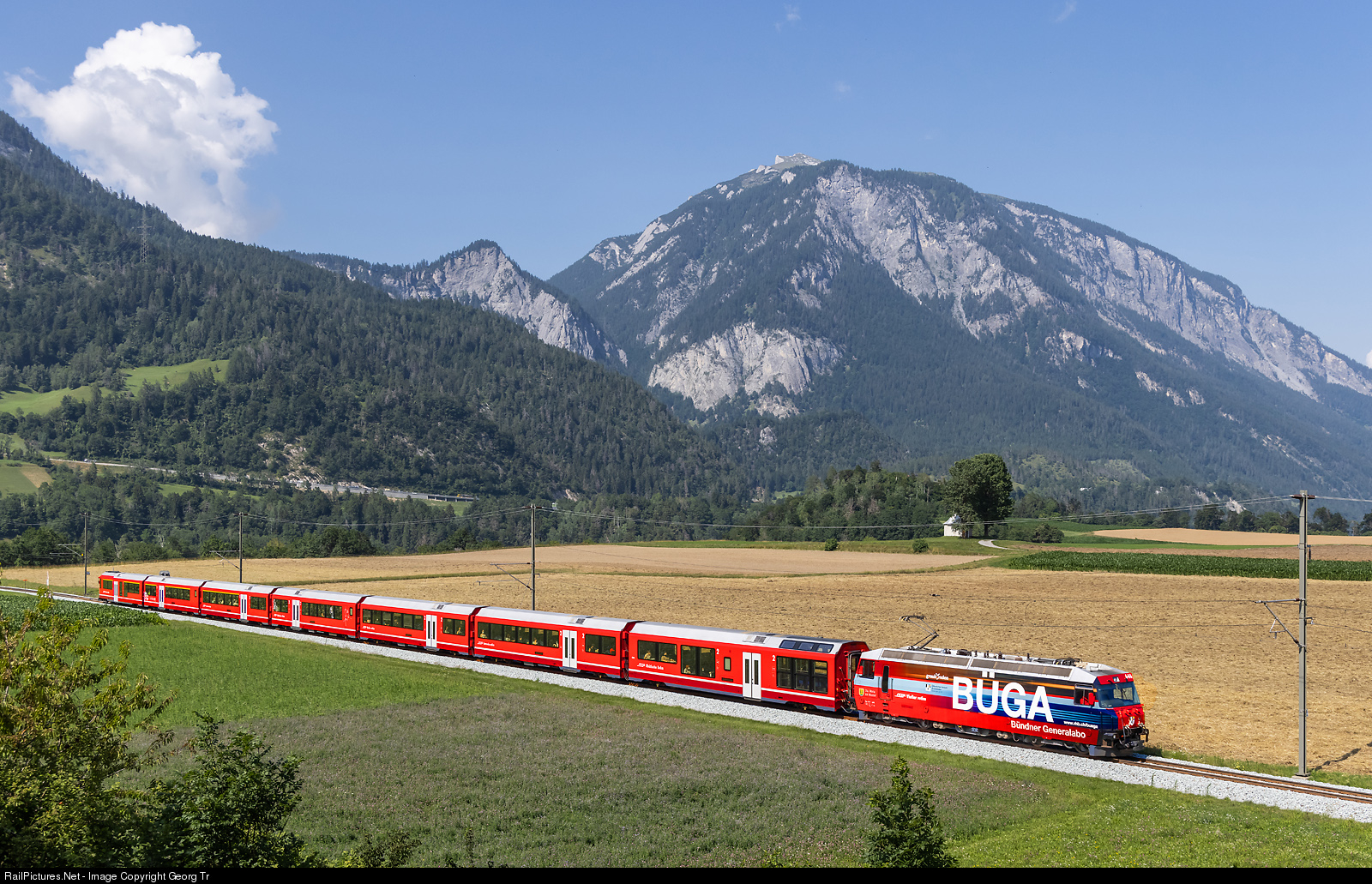 | Ge 4/4 III # 646 of the Rhaetian Railway, in the publicity paint scheme for the BÜGA (global ticket for Grison), is pulling the IR 1153 from Chur to St.Moritz, between Reichenau-Tamins and Bonaduz. This is an ALVRA psuh-pull train with 6 permanently coupled cars and a cab car At in the rear. |
