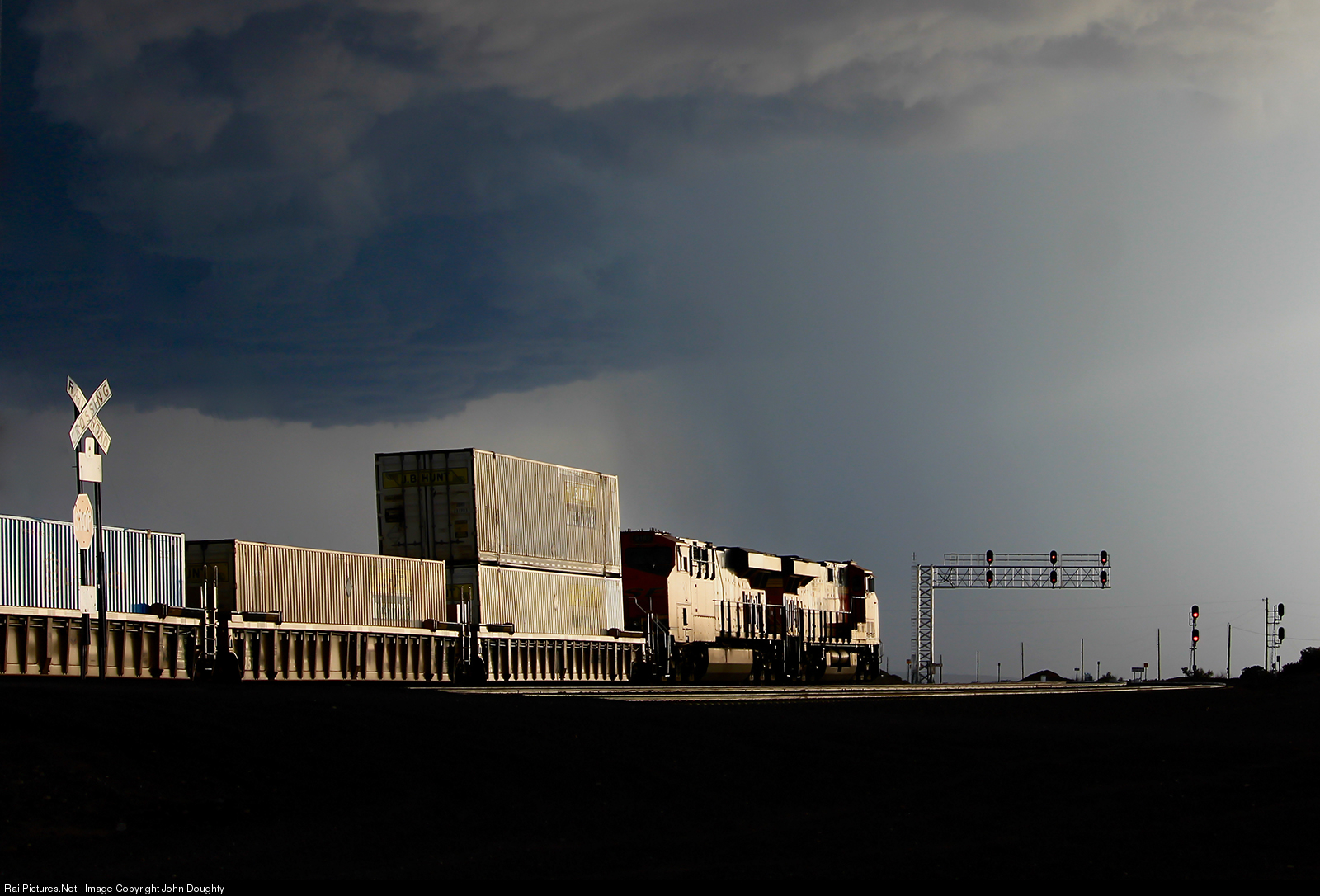 BNSF 6635 has been given a yellow signal from the dispatcher to slowly proceed west as a severe thunderstorm slowly drifts south out of the Dalies, New Mexico area. The dispatcher held three westbound trains at Dalies due to a high wind gust warning of 65 mph between Belen and extending 91 miles to the west.