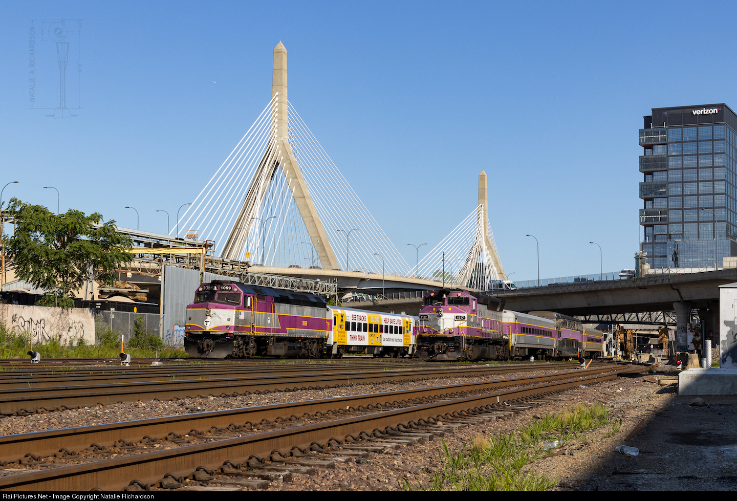 | The evening weekday commuter rush is in full swing as an Inbound and Outbound Keolis move meet just north of Tower A and Boston North Station. The two moves, both headed up by classic MBTA motive power and surrounded by signaling and relics of Boston and Maine Railroad are dwarfed by towering Boston, MA skyline. Despite the multitude of rarities dotted throughout this photo, it's just another day for commuters riding out of Boston headed home after a long day in the city. |