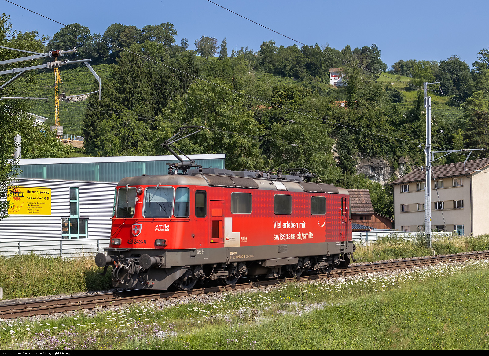 | Re 420 # 243 of the SBB with a publicity paint scheme for Swisspass/Smile, is running from Buchs SG via St.Margrethen-Rorschach-Romanshorn VL to Frauenfeld, in Au SG. |