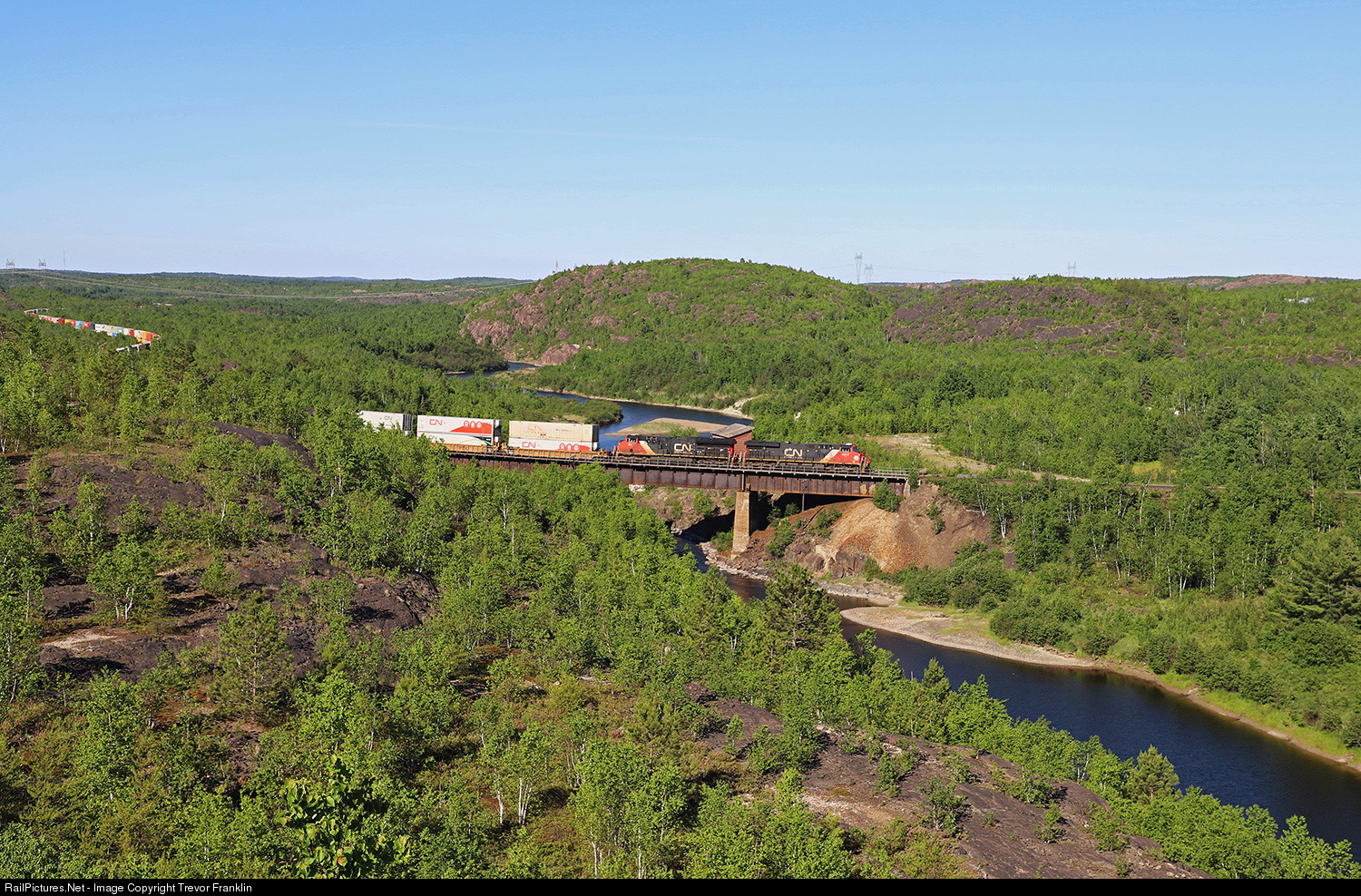 | A pair of GEs rumble across the Wanapitei River guiding 111’s train north during the early morning hours in Coniston. Though the head end is through much of the tougher terrain, the long string of stacks in tow are still winding their way through the imposing rock formations with the right of way strategically paralleling the river from St. Cloud/Wanup. |