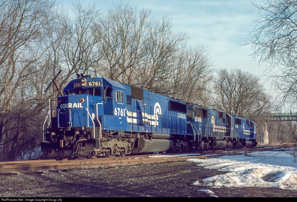 | The crew Conrail train UPS has delivered a trainload of coal to Metropolitan Edison’s Portland Generating Station in Portland, Pennsylvania, and is now having a well-deserved meal at the Portland Diner. The three SD50’s in their charge idle directly behind the diner. |