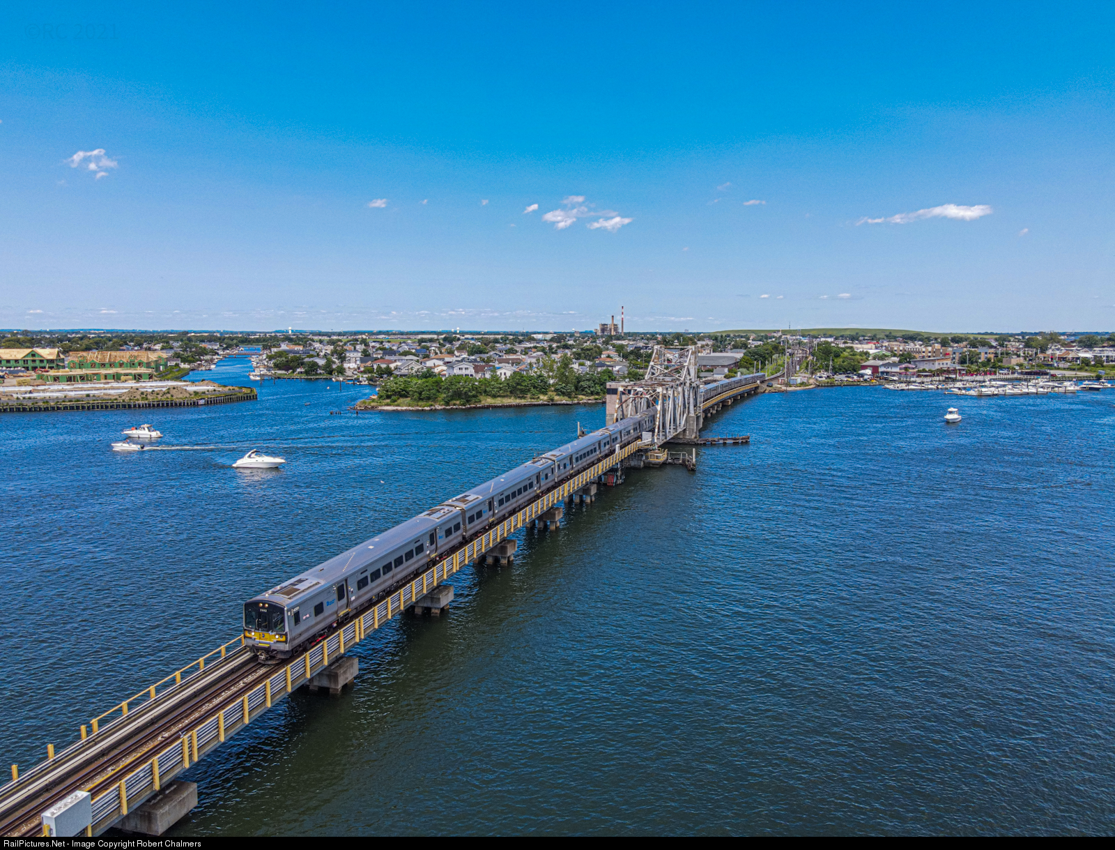 An outbound M7 goes over a bridge in Island Park approaching Long Beach.