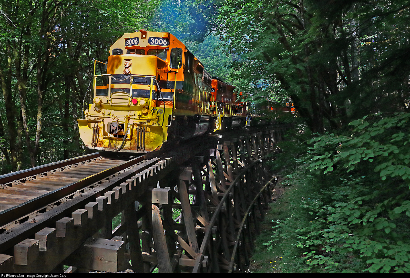The Toledo Hauler lifts a heavy eastbound cut of paper up the west slope of the Coast Range, across the Big Sixty Trestle. The reason for the name Big Sixty seems to have been lost to time, however the height seems to be approximately 60 feet high, perhaps this is where the name came from? The railroad was originally the Oregon Pacific, later the Southern Pacific and currently a arm of the Genesee & Wyoming .