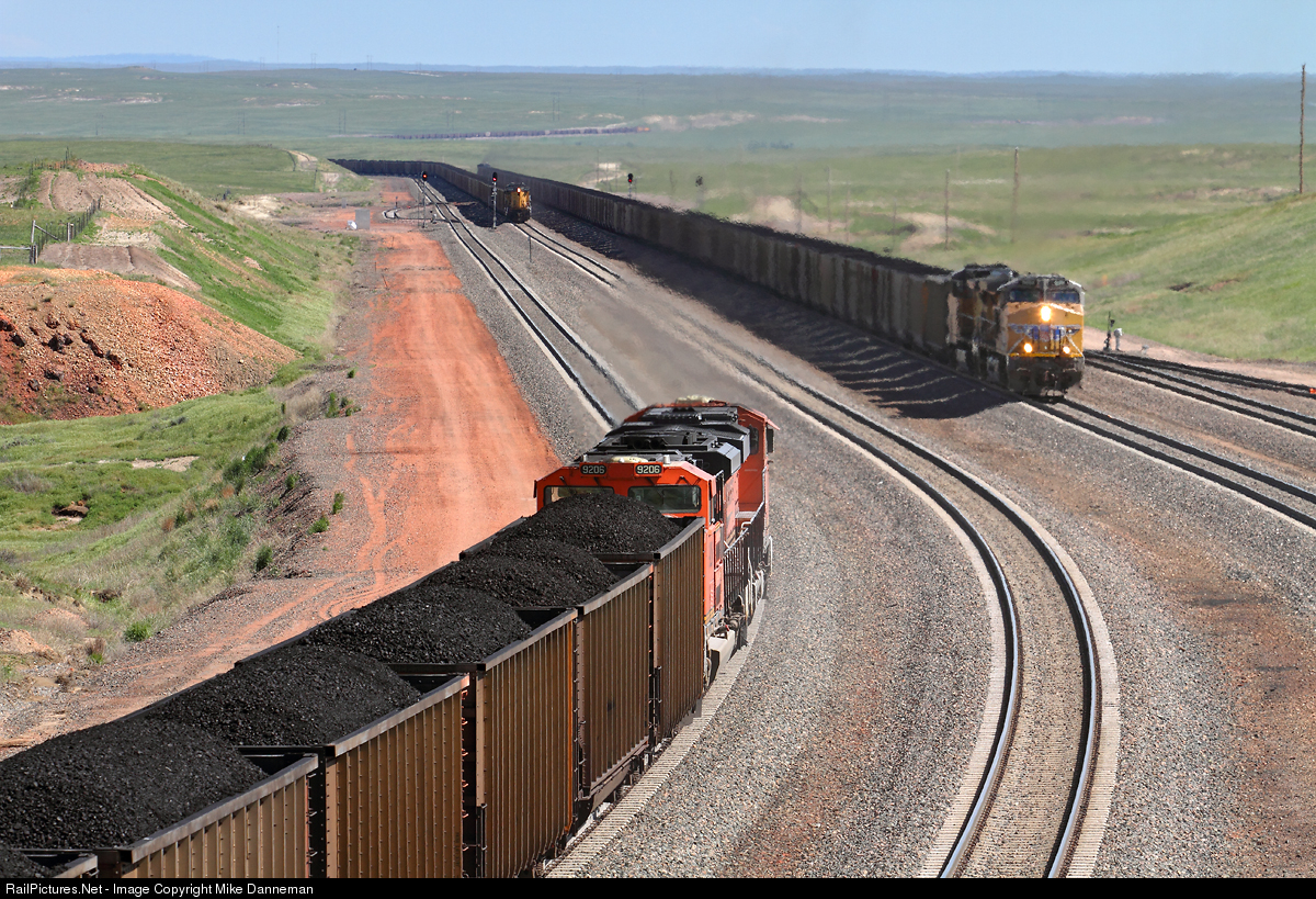 A BNSF coal train is about to meet a Union Pacific coal empty at the top of Logan Hill north of Bill, Wyoming, on June 18, 2015. The BNSF train on Track 1 is following another UP load on Track 2, while down the hill in the distance is another UP coal train headed for Bill.