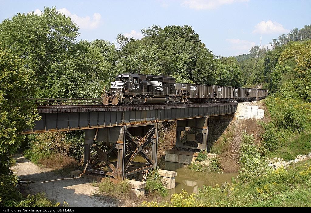 | Showing she still has what it takes in today's world of AC traction units, a former N&W SD40-2 hustles over 100 mty across Davis Branch on the way to the big yard at Williamson. These are former N&W rails and the big EMD is feeling right at home! |