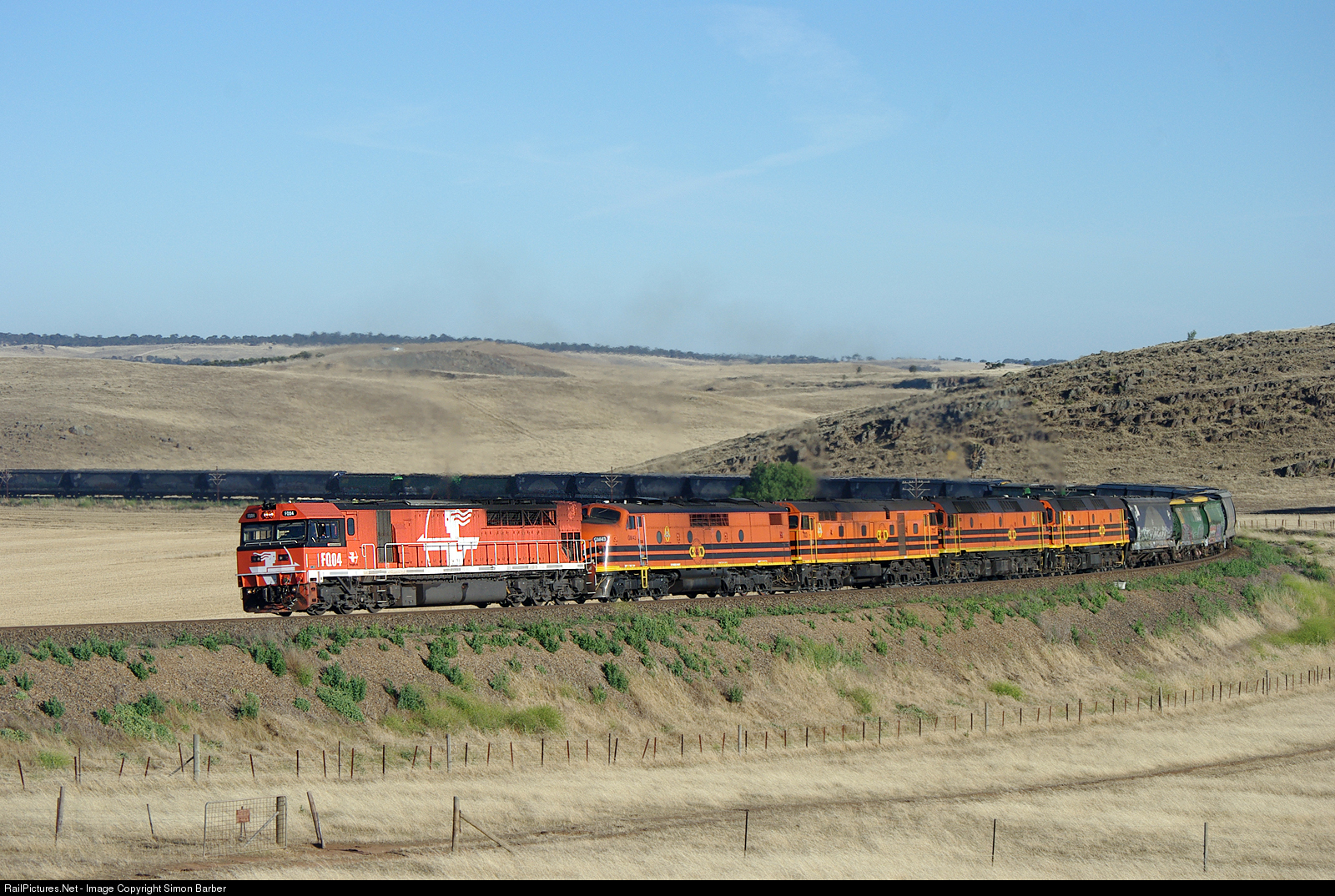 FQ04, GM43, 703, 2210 and 2212 round the curve at Callington with a grain train from Tailem Bend.