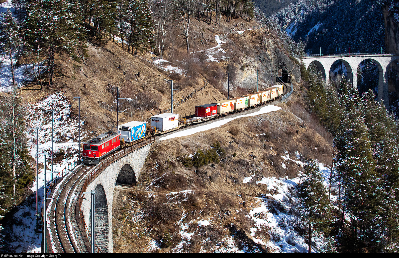 | Ge 6/6 II # 707 "Scuol" of the Rheatian Railway is pulling freight train 5140 from Pontresina to Landquart on the Albula line between Landwasser and Schmittentobel viaduct near Filisur. In the rear of the train 6 short freight cars with reefer containers of Coop, the large swiss retailer. |