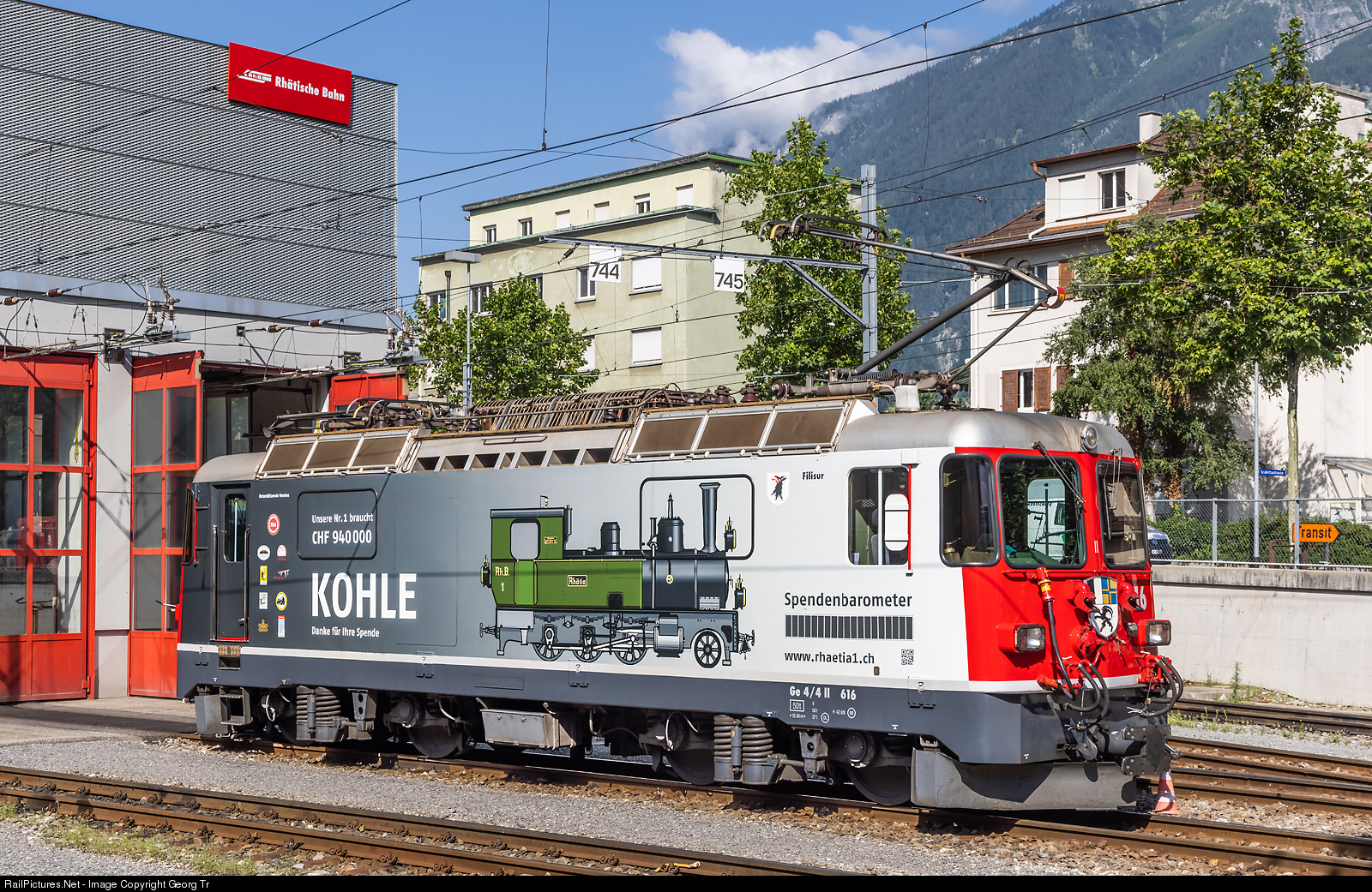 In front of the shed in Chur, the Ge 4/4 II # 616 "Filisur" in the special paint scheme for collecting donations for the renovating of steamlocomotive G 3/4 # 1 "RHAETIA", is waiting to pull the GLACIER EXPRESS to Disentis later. Since november 9th, 2018, the locomotive has this paint scheme, made possible by the Rhaetian Railway and designed by the young graphic designer Michaela Rapp, who describes herself as the biggest fan of the RhB. Since November 2018, more than 940,000 Swiss francs in donations have been collected, small and larger amounts, including from model train companies that made the model. The steam locomotive G 3/4 # 1 "RHAETIA" was built in 1889 by SLM in Winterthur for the Landquart-Davos Railway (LD), which was the predecessor company of the RhB. At the moment, the locomotive is partially disassembled and waiting at the Landquart depot for repair work, which includes, among other things, a new copper firebox.
