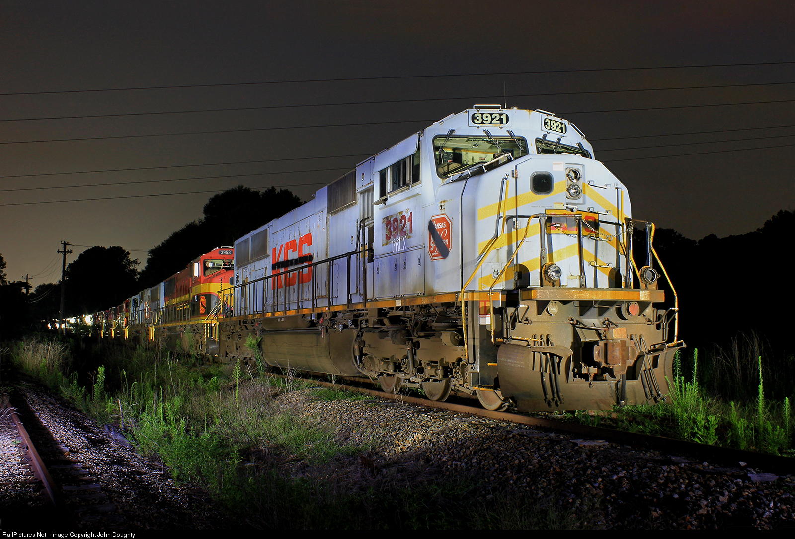 | Kansas City Southern 3921 is one of many KSC SD70MACs stored on the loop track in Thomaston, Georgia. There are five of these KCS SD70MACs in the older grey paint scheme. |