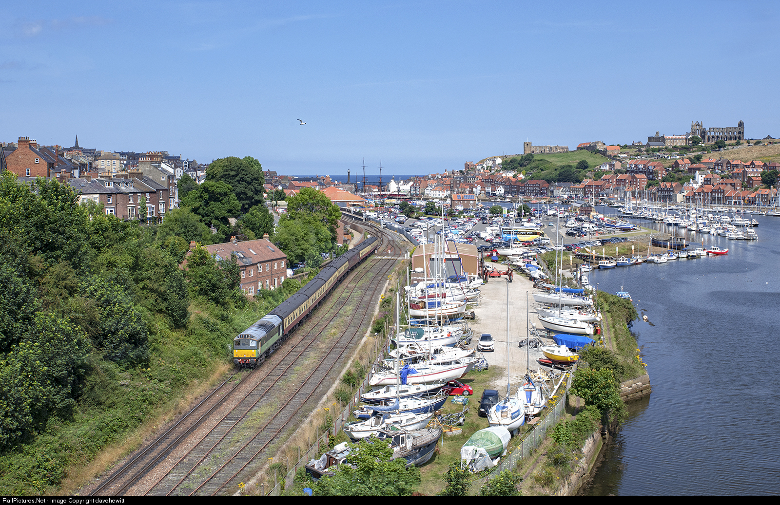 This seaside town is Whitby in North Yorkshire and since 1897 it has become famous as the place where Dracula landed in England. On the far right of the picture are the ruins of Whitby Abbey, built in the 13th century,and to the left is a church on a cliff. It was here, according to Bram Stoker that Dracula's ship ran aground and a large black dog leapt from the decking onto the sand. vampires are well known for being able to transform into dogs by the way. More mundanely a class 26 is in charge of the train from Whitby to Pickering, a service run by the North Yorkshire Moors preserved railway even though these are British Railways tracks.