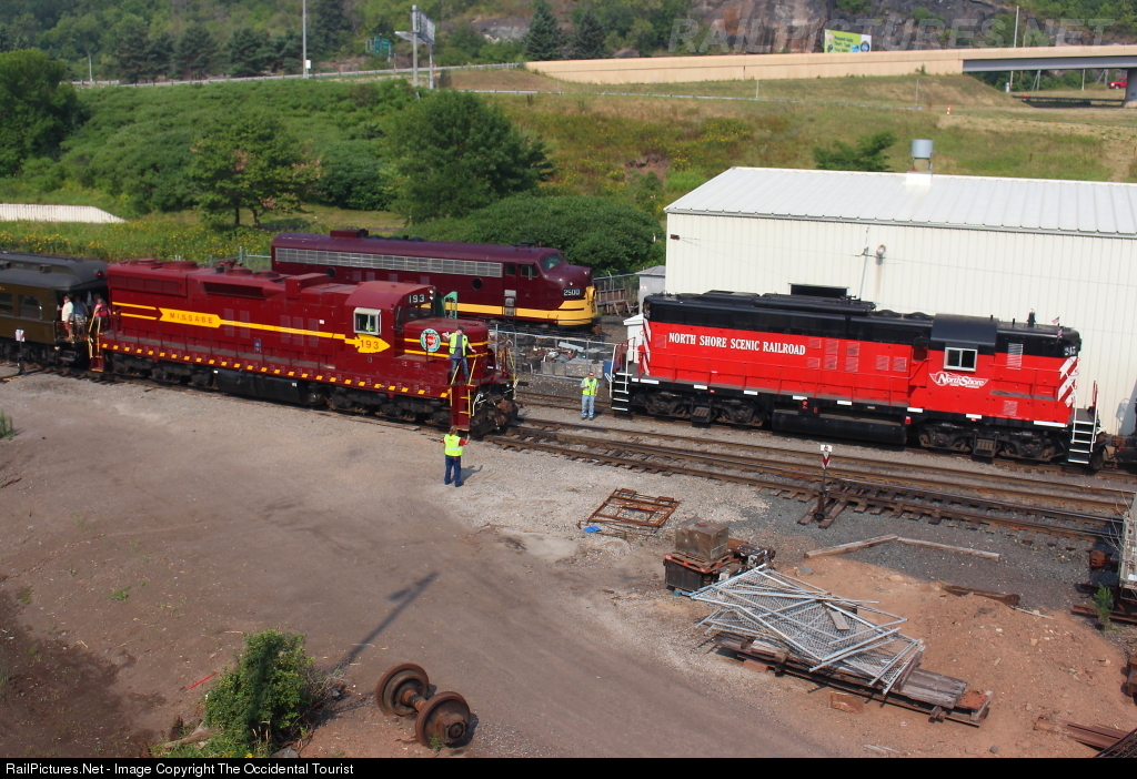 #193 with a Two Harbors excursion is passing the Duluth Zephyr with #245.
