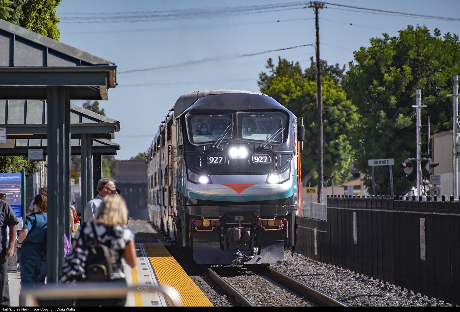 At 3:00 pm (15:00) this trainset passed through Orange as Metrolink train 684, an Orange County Line train operating from Los Angeles to Laguna Niguel/Mission Viejo (Orange County’s "twin cities"). Twenty minutes later, with the crew relocated from the cab car to the cab of F125 927, this train departed northbound not for Los Angeles, but rather San Bernardino, as Inland Empire-Orange County Line train 808. Note that both crew members are wearing masks, in compliance with FRA Emergency Order 32 [https://railroads.dot.gov/sites/fra.dot.gov/files/2021-02/Signed%20EO%2032%20%28Face%20Masks%29%20-%202.24.2021.pdf]. (Orange, California – August 3, 2021)
