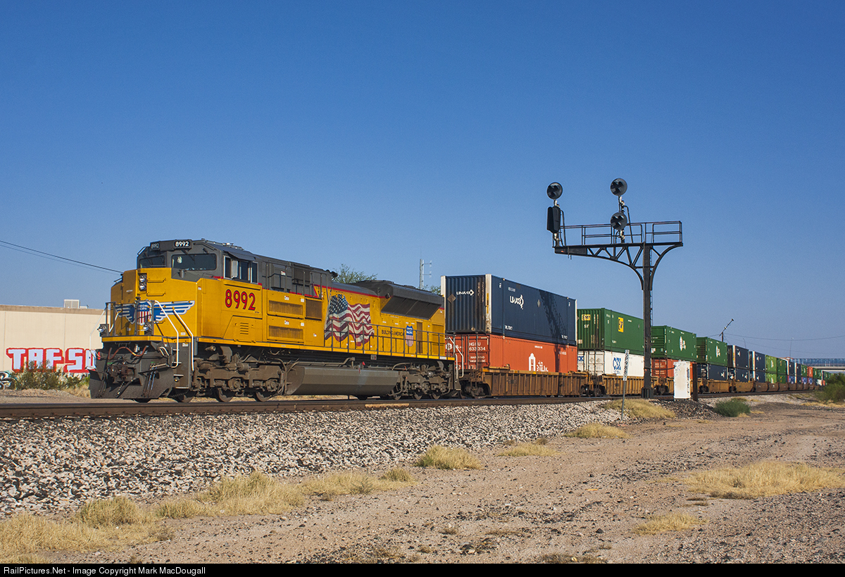 A clean SD70AH shoves on the rear of Dupo, IL to Long Beach, CA intermodal IDULB. An ex-SP cantilever signal bridge guards westbound movements at CP SP988, the east end of Tucson Yard. On it are three tri-light target signals, what seemed to be the go-to signal towards the end of the SP era and early UP in the 90's. Also included is a newer hooded signal, adding infrastructure from a third era of signaling. This signal structure has since been removed. The domestic containers the 8992 is coupled to are part of IDULB's East Los Angeles set out, and will be unloaded at the intermodal yard there while the marine containers on the front of the train will continue to ICTF.