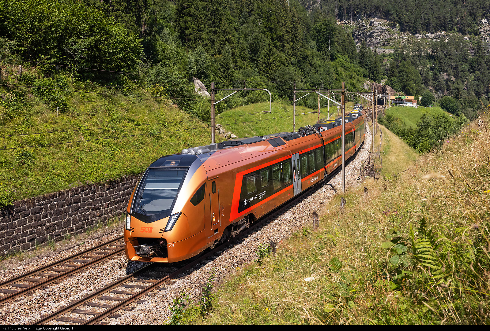 | "Traverso" train built by StadlerRail, RABe 526 # 207/107 of the Südostbahn (SOB), is running the TRENO GOTTARDO IR 2319 of the line IR 26 from Basel via Lucerne-Gotthard mountain line-Bellinzona to Locarno, on the uppermost level of the loops at Wassen. The Südostbahn is running this trains since change of timetable in december 2020 in behalf of the SBB. |