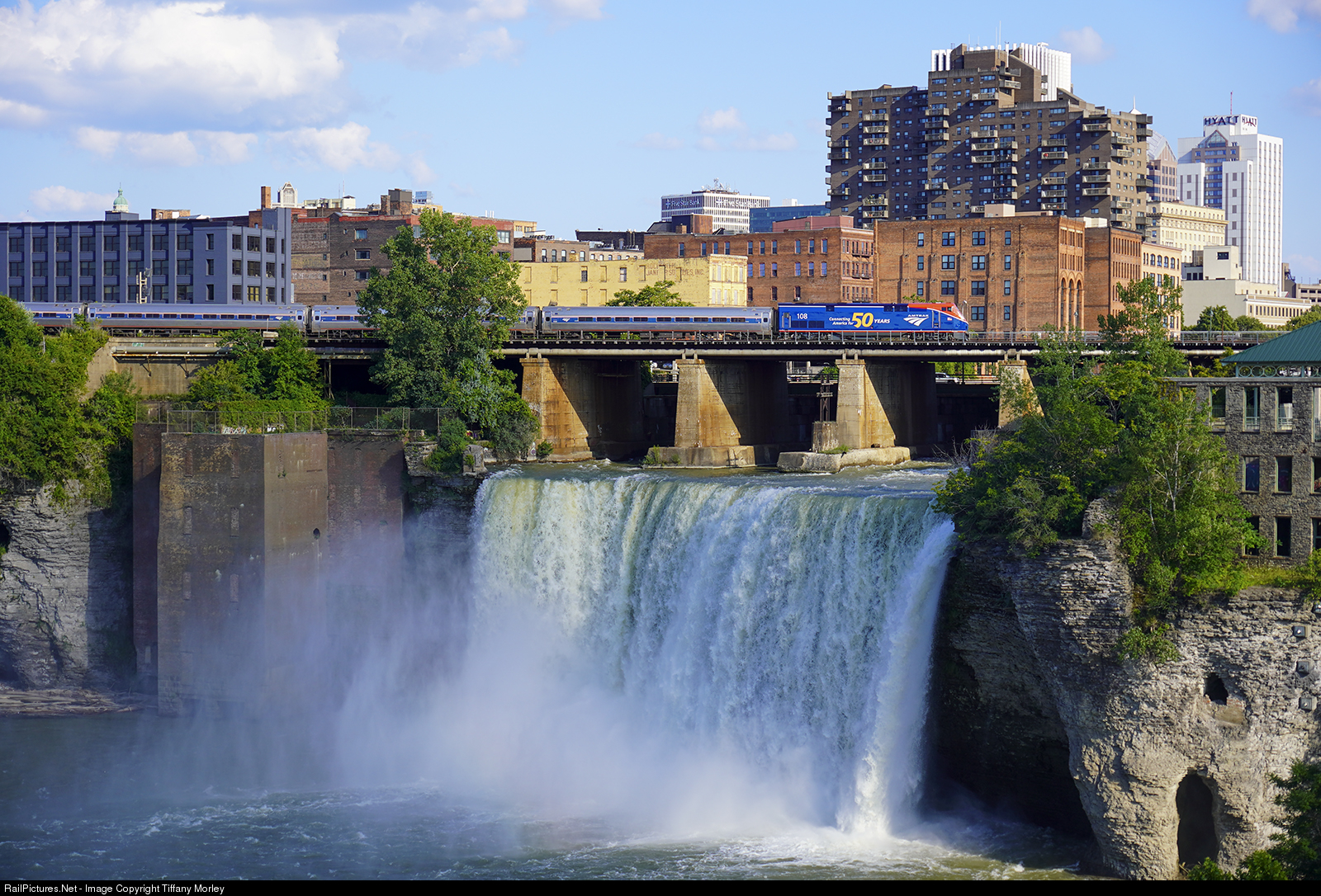 The Empire Service crosses the High Falls of the Genesee River in the early evening with the new "Phase VI 50th Anniversary" unit.
