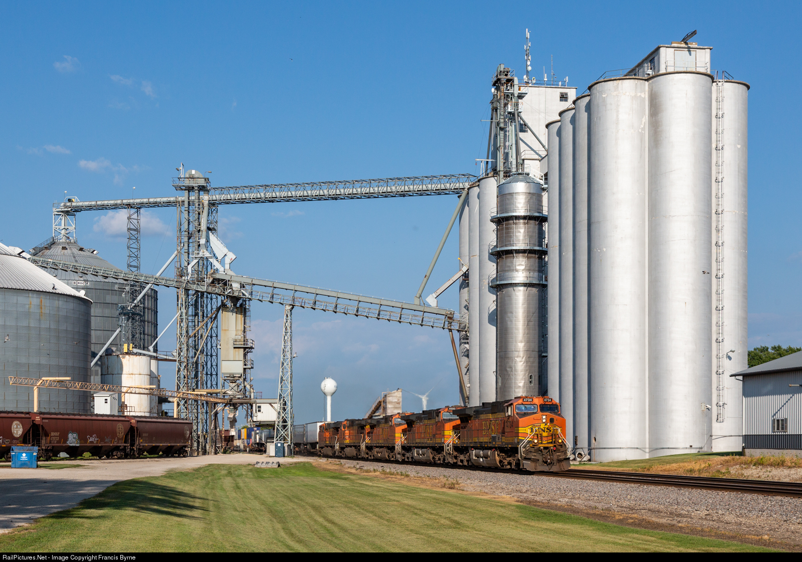A five-pack of BNSF power is firing on all cylinders to get this high-priority train to points west. FS Grain, the main feature of Ransom, Illinois, towers over the scene.