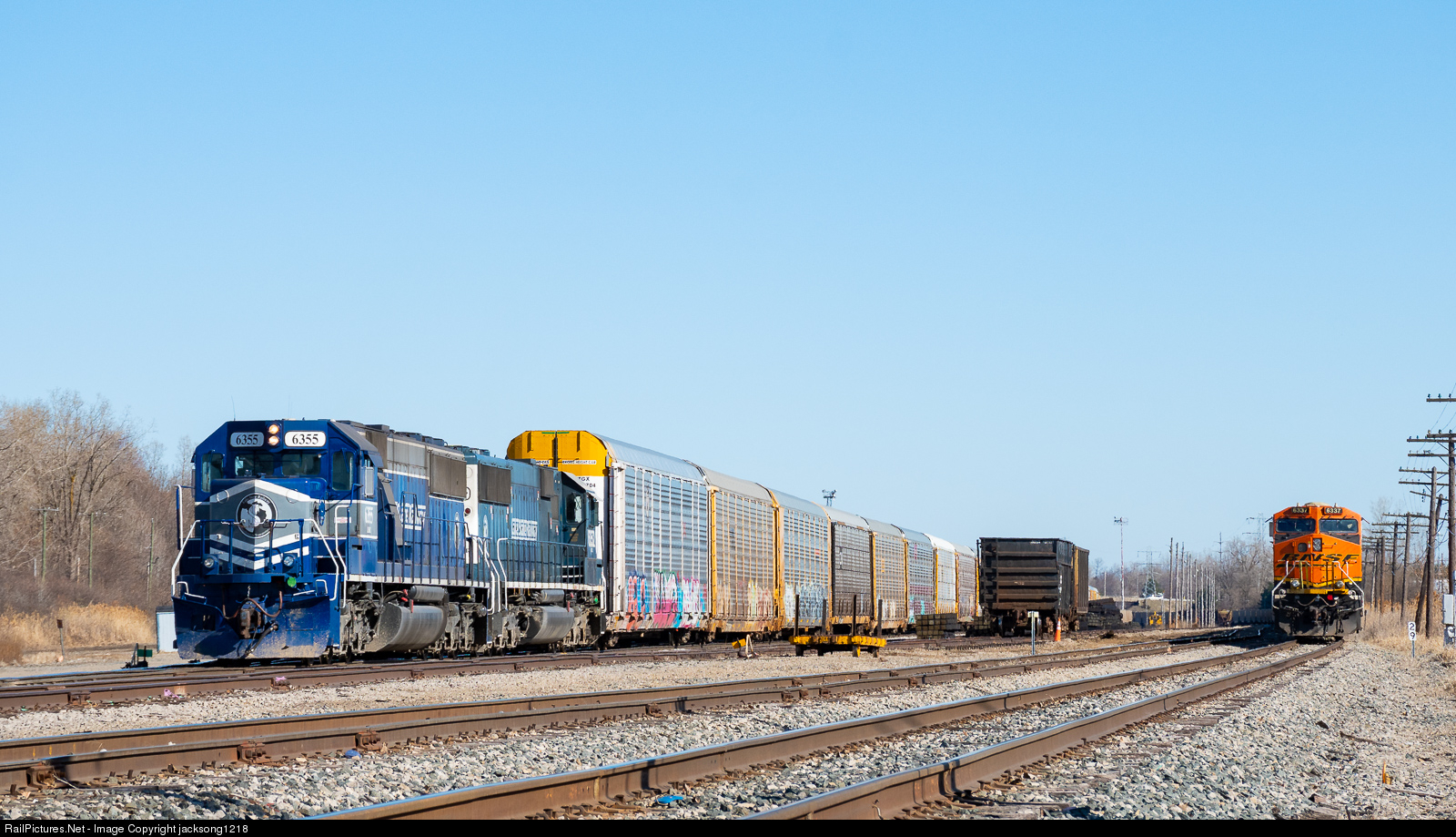 | Lake State Railway train Z127 ties onto a cut of autoracks in their Flint, MI yard before heading south with them towards Wixom. Also sitting in the yard is an empty coal train with a pair of BNSF GEs, that will follow Z127 south a few hours later. |