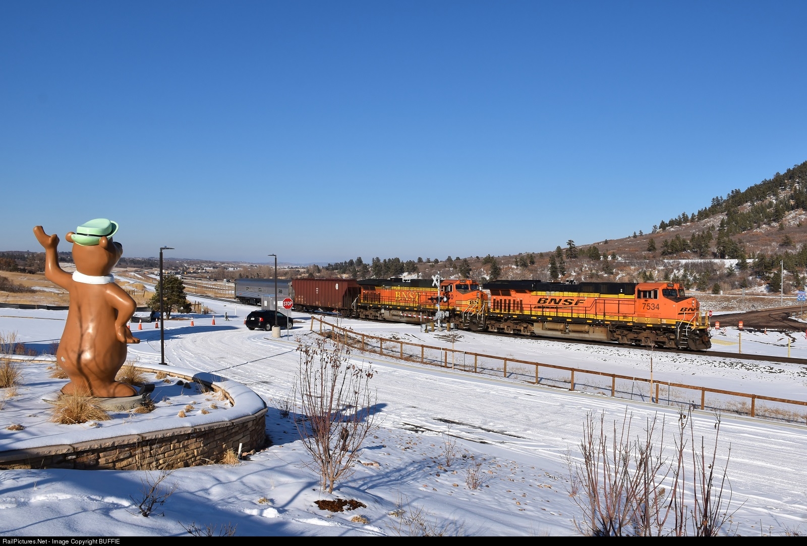 BNSF 7534 (ES44DC) leads a GEO train past Yogi the Bear at the Jellystone Campground just west of Larkspur, Colorado.