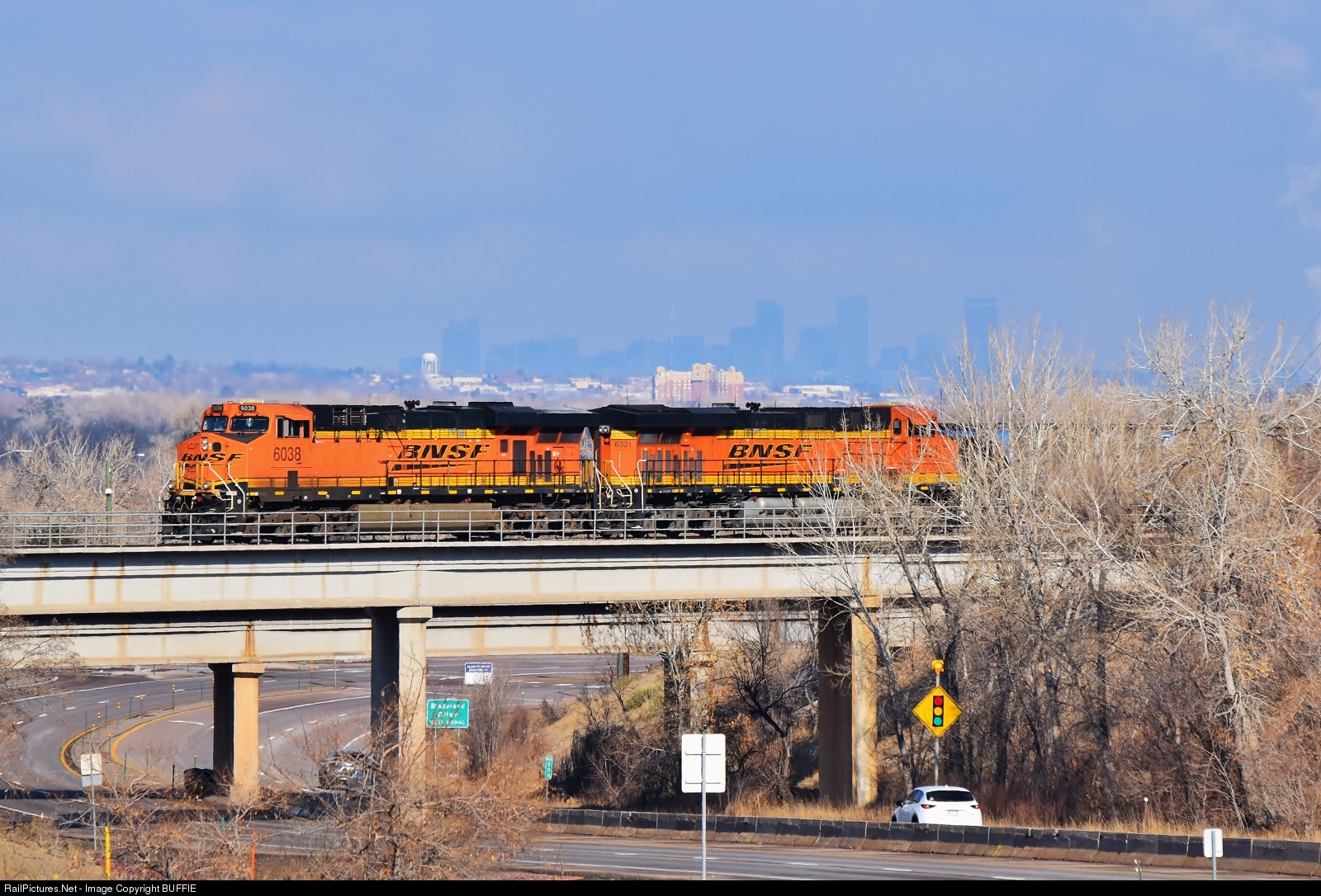 | BNSF 6038 (ES44AC) crosses over Santa Fe Drive in Douglas County as it heads towards the Denver, Colorado skyline seen in the background. |