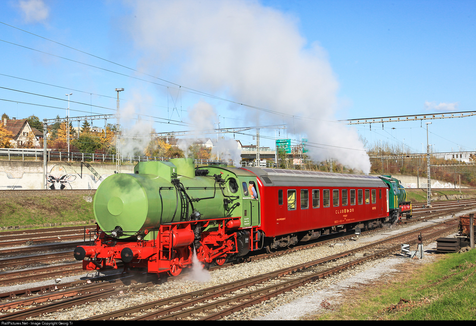 | Two fireless steam locomotives were introduced by the DLM AG (Dampflokomotiv- und Maschinenfabrik AG) to potential customers this day. The 3 axle tank locomotives were built in 1987 by RAW Meiningen in the GDR (German Democratic Republic/DDR) as type FLC. 202 locomotives of this type FLC were built in Meiningen from 1984 to 1987. The T 380 # 002 was running for the VEB Likörfabrik Zahna/GDR and came to the MKO - Museumseisenbahn Küstenbahn Ostfriesland e. V., Norden/Germany in 1995. In the background is T 380 # 001, built in 1987 as well. Both locomotives are still stabled in Schaffhausen today, a rental or sale has not succeeded so far. |