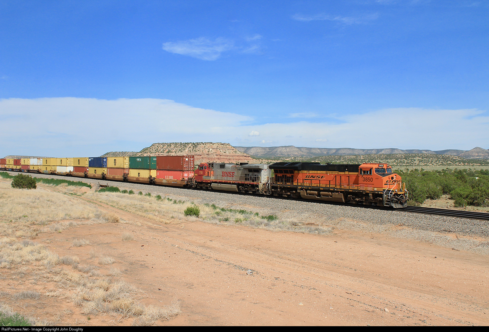 | BNSF 3850 and former Santa Fe 710 push hard on the rear of an eastbound doublestack as it works towards the summit of Abo Canyon near Mountainair, New Mexico. |