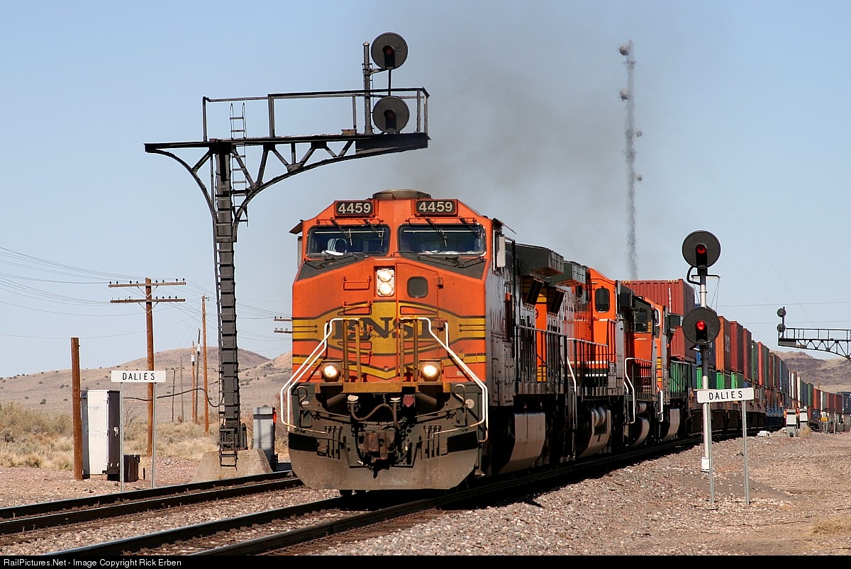 Westbound BNSF 4459 is cresting the grade out of the Rio Grande River valley from Belen at Dalies, NM. The old main line via Raton and Albuquerque joins the Transcon here. Once upon a time, beautiful cantilever and searchlight signals populated Santa Fe lines from Illinois to California. How attractive they were, versus the bland traffic lights now prevalent.
