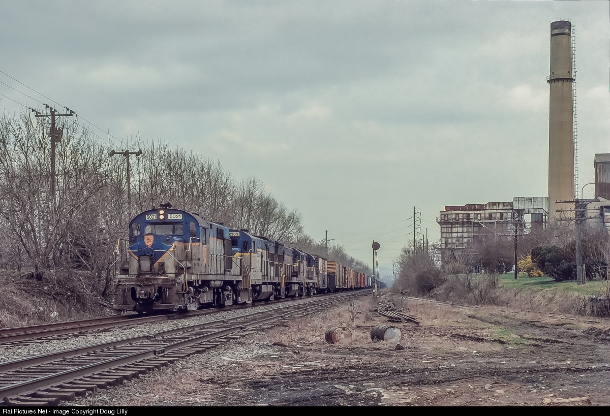 Delaware & Hudson train MA-2 (Mechanicville, NY – Allentown, PA) was one of several run-through trains that brought D&H power to Allentown and Lehigh Valley power to D&H destinations. Here a pair of D&H RS36’s bracket a pair of U23B’s bringing the train past the Dragon Cement mill in Siegfried, Pennsylvania. In five days, the Lehigh Valley will cease to exist, and the D&H will be operating its own trains on trackage rights over this route. The concurrent addition of 20 Reading GP39-2’s, twelve Lehigh Valley GP38-2’s, and a dozen LV C420’s to the D&H roster will make the sight of a pure set of lightning stripes a rare occurrence.