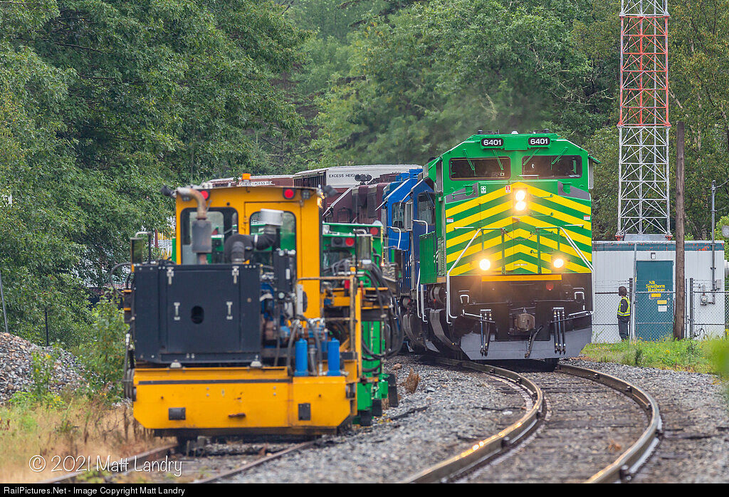 | On it's first revenue run, NBSR 6401, an ex Norfolk Southern SD70M-2 leads train 907 by some track machinery at Westfield Beach, New Brunswick. |
