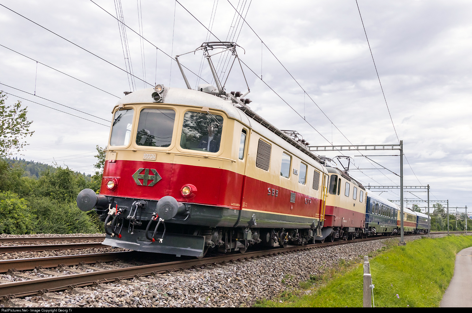 Former SBB Re 4/4 I # 10034, now privately owned and operated by association "TEE-Classics", is pulling the charter train "TEE Emmental II", organised by TR TransRail, together with former SBB Re 4/4 II # 11393 (Re 421 393) of the IRSI (International Rolling Stock Investment Gmbh), between Winterthur and Winterthur Tössmühle. The cars are of the Schweizerische Speisewagengesellschaft (SSG) of BRM Investment: blue dining car "Genève" D-BRM 56 80 85-92 150-6 BRmh, red/cream dining car "Chur" D-BRM 56 80 85-95 153-7 ARm and blue dining car "Lugano" D-BRM 56 80 88-70 106-1 WRm. The train journey was from Winterthur via Wallisellen-Zürich HB-Wettingen-Mellingen-Lenzburg-Olten-Solothurn-Biel-Zollikofen-Gümligen-Konolfingen-Langnau im Emmental-Ramsei-Sumiswald-Grünen-Ei-Sumiswald-Huttwil-Langenthal-Olten-Lenzburg-Mellingen-Wettingen-Zürich HB-Wallisellen to Winterthur.