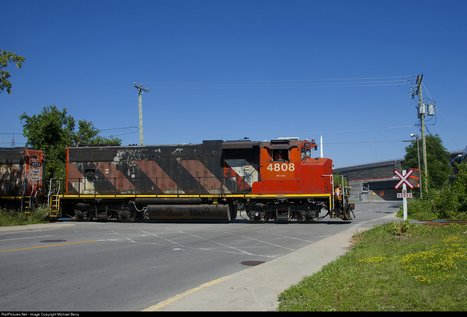 Conductor and rp contributor Nicolas Houde has just finished flagging busy Monk Boulevard as the Pointe St-Charles Switcher leaves the Turcot Holding Spur with one boxcar from Kruger, one of two clients on this line which is only served once or twice a week.