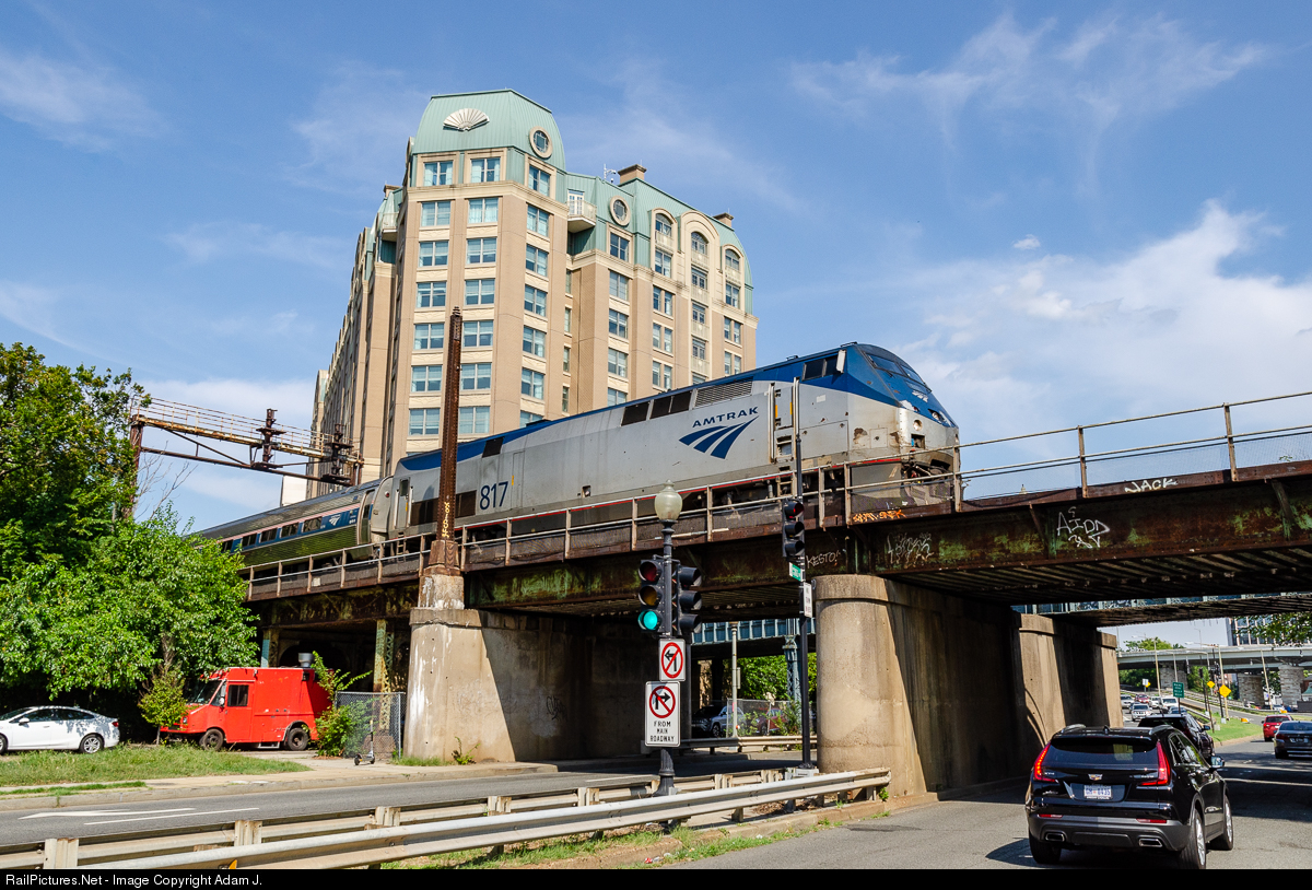 | Amtrak moves over Maine Avenue, and under the Mandarin Oriental Hotel on a clear and sunny day. Truly one of those days that makes you want to get out and take some pictures! |